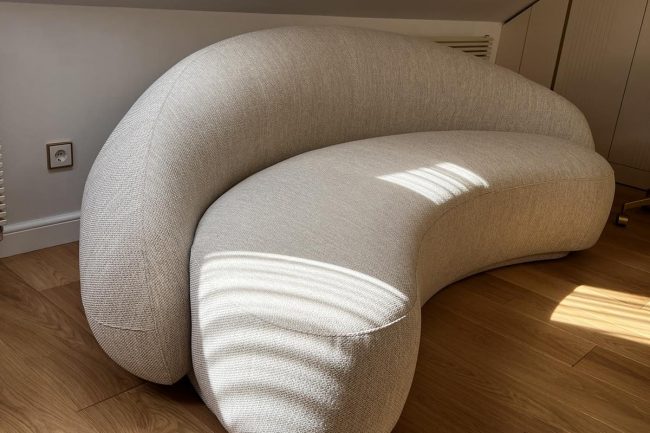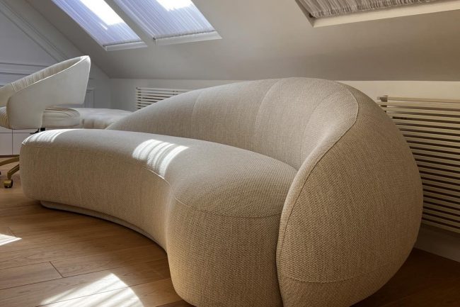 Для відпочинку у кімнаті передбачена велика софа-рекаме, яка гармонійно вписується в інтер’єр, додаючи додатковий простір для релаксу.