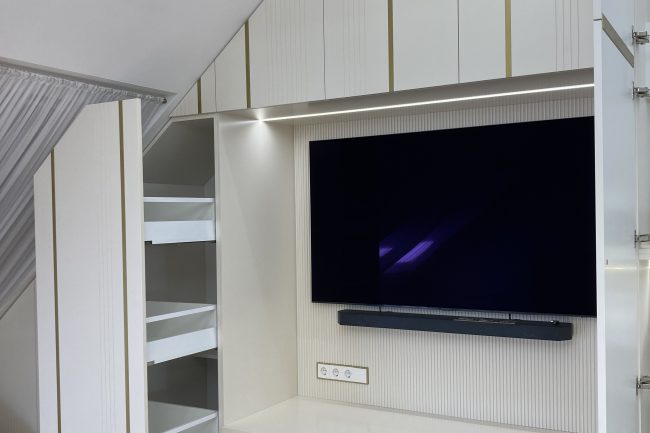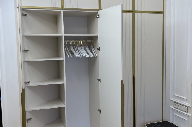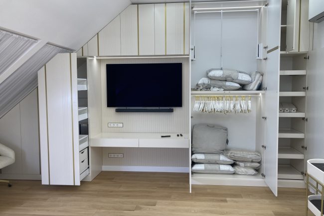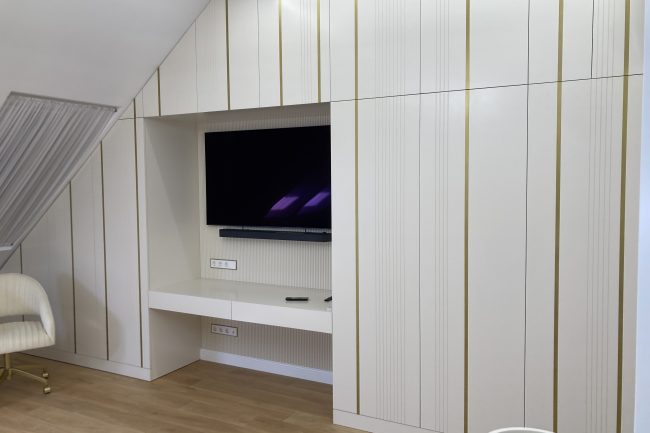 Біля ліжка стоять два пуфи, які підкреслюють загальний стиль приміщення, а навпроти ліжка розташована велика функціональна шафа з вбудованим робочим місцем — це ідеальний простір для навчання або творчості. Поруч з ліжком знаходиться велика вбудована шафа для одягу, що надає зручність зберігання речей.