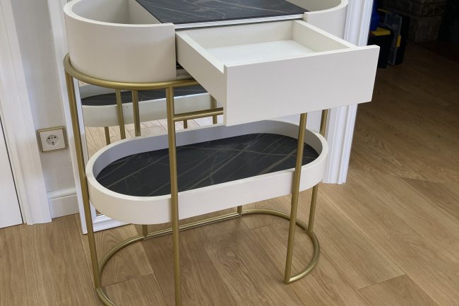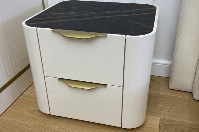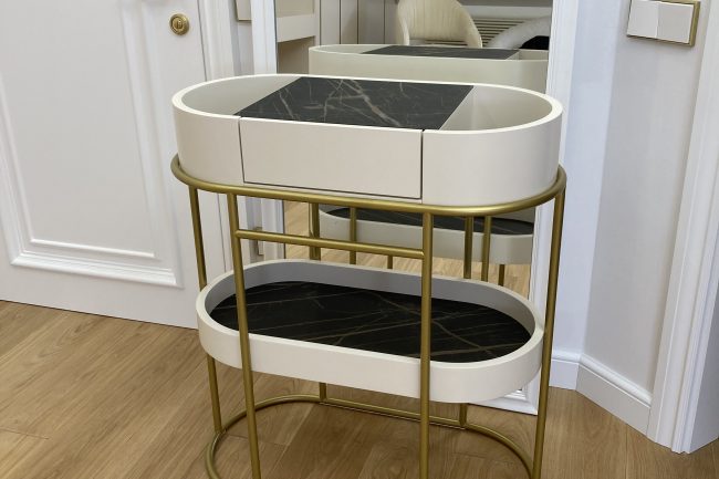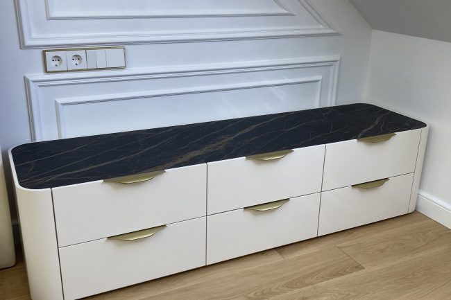 Спальня в стилі неокласика для молодої дівчини оформлена з використанням витончених деталей і сучасних акцентів, що підкреслюють комфорт та елегантність. Центральне місце в інтер’єрі займає велике м’яке ліжко, яке, з обох боків, обрамлене приліжковими тумбами із заокругленими кутами. Стільниці тумб виконані з чорного мармуру з білими розводами, додаючи легку нотку розкоші.