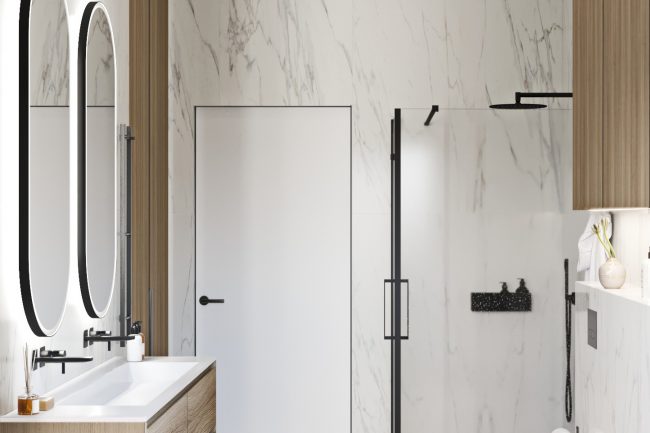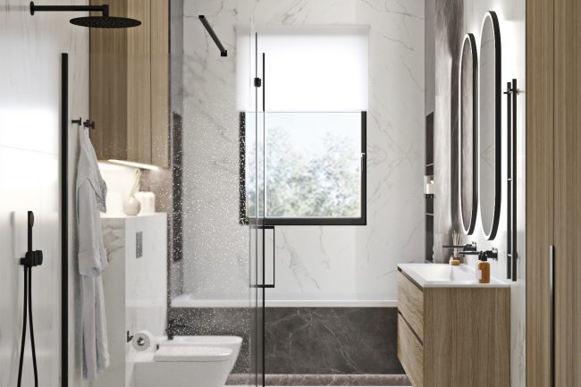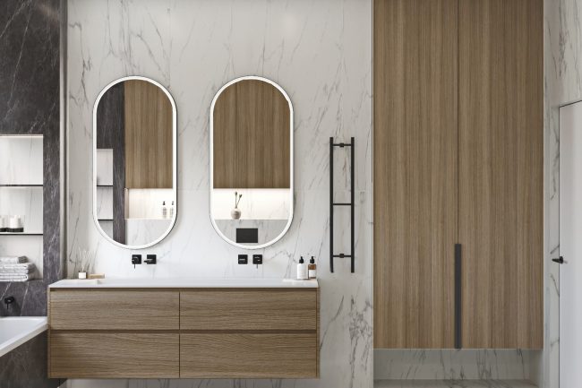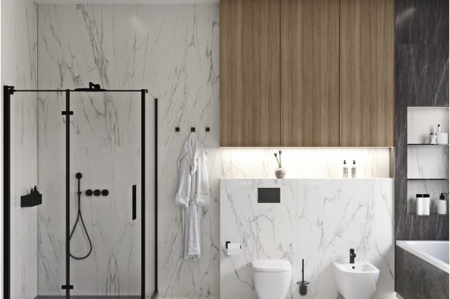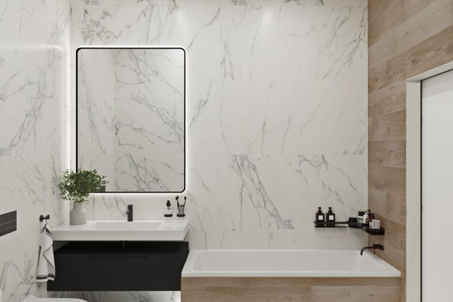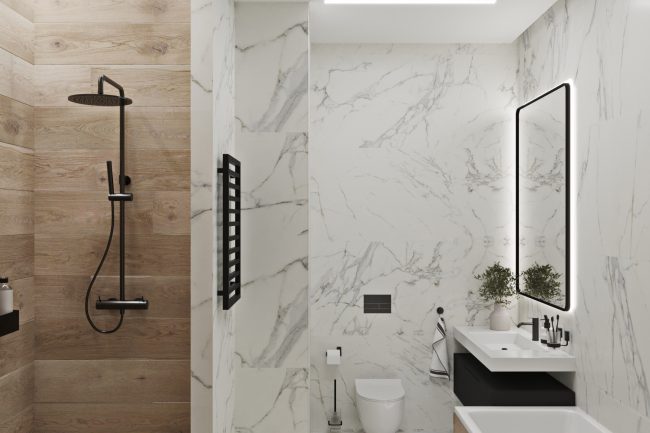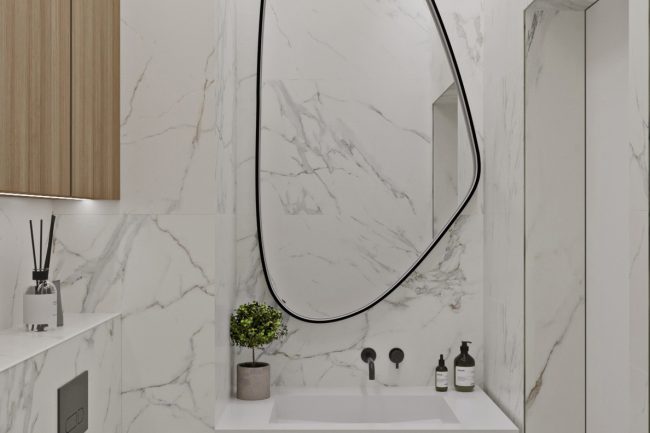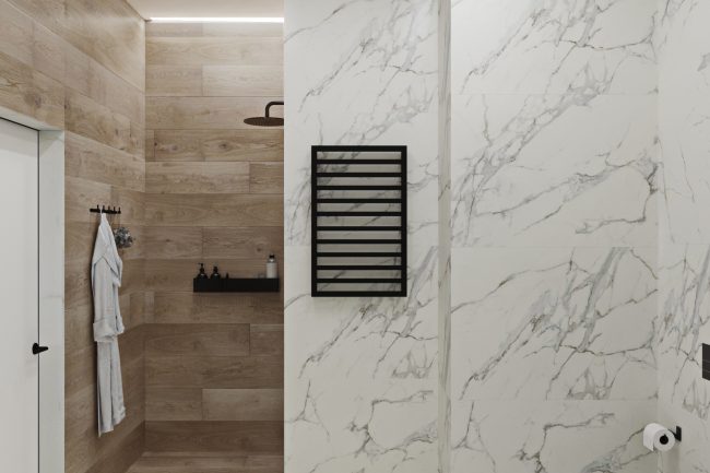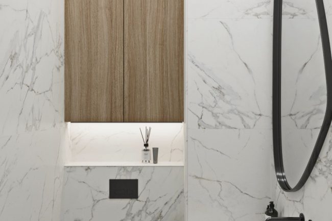 Санвузли виконані з урахуванням елегантності та практичності. Фактурні дерев’яні елементи поєднуються з плиткою, що імітує мармур. Такий концептуальний дизайн робить кожне приміщення цього будинку унікальним.