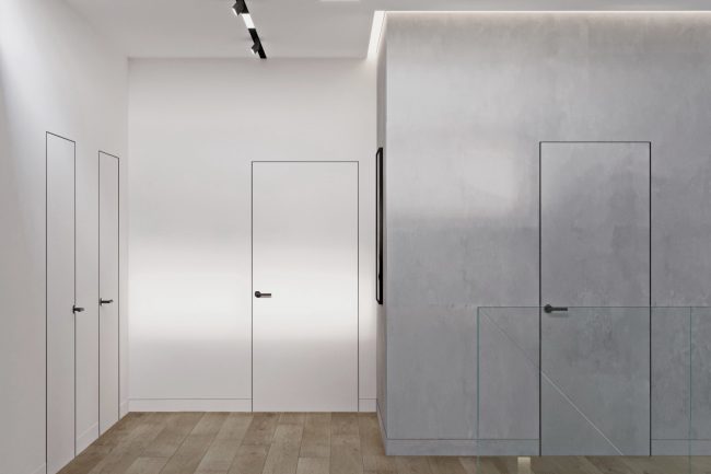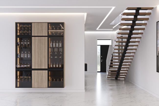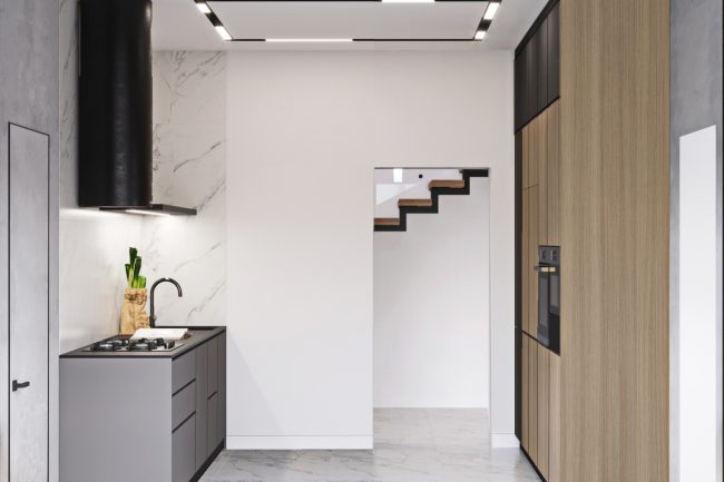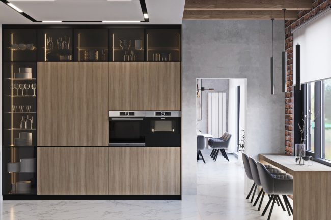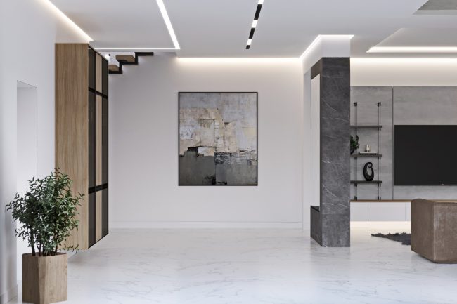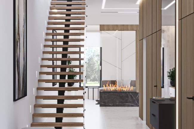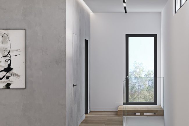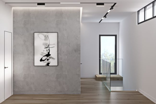 У дизайні інтерʼєру сучасного будинку з елементами лофту, кожен куток вражає своєю естетикою та функціональністю. При вході вас зустрічає великий широкий коридор, який плавно переходить у вітальню. Стіни коридору прикрашені дерев’яними панелями з чорною розшивкою, надаючи приміщенню стильний індивідуальний характер.