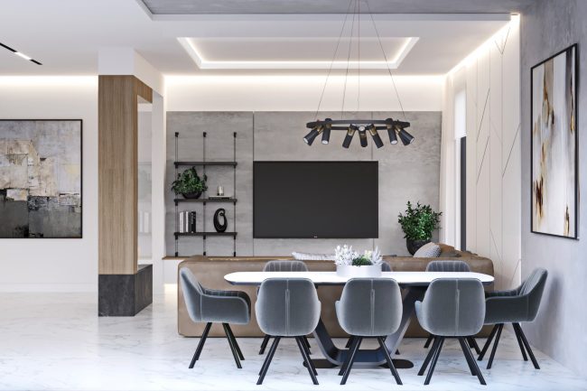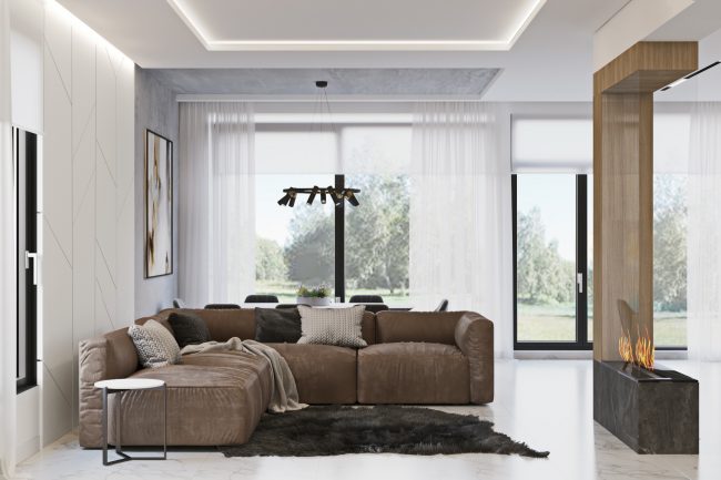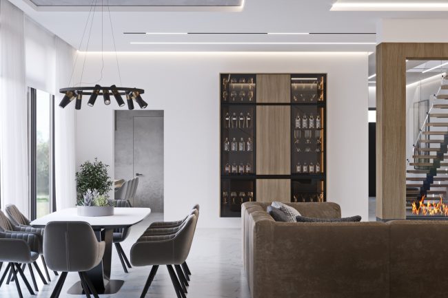 Вітальня є справжнім центром приміщення. Біо-камін, обкладений темно-сірим мармуром, видає тепло і розкіш. Великий кутовий диван із телевізором створюють ідеальний куточок для відпочинку. Обідня зона з видовженим столом і великою барною шафою виглядає стильно та функціонально.