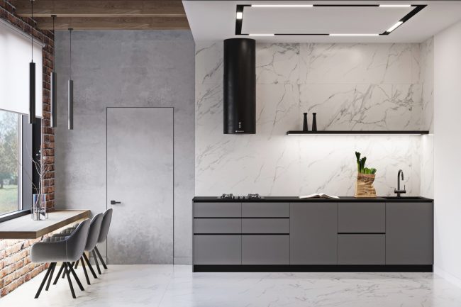 Підлога в цьому будинку – це справжнє мистецтво. Великоформатна плитка білого мармуру з сірою прожилкою надає кожному приміщенню розкішного вигляду. Кухня вражає поєднанням дерев’яних та сірих фасадів, а барна стійка з трьома кріслами створює атмосферу затишку та спілкування.
