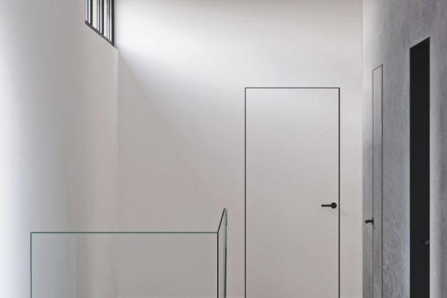 У цьому просторі також розміщено велике дзеркало від підлоги до стелі, яке розширює простір і візуально збільшує його розміри. Широкі сходи на металевому косоурі з дерев’яними сходинками і скляним поруччям ведуть на другий поверх, створюючи враження легкості та прозорості.