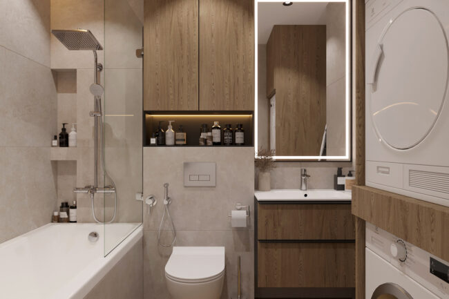 ✔ Головний санвузол – ванна, вбудовані шафи для зберігання, стильне підсвічування дзеркала.