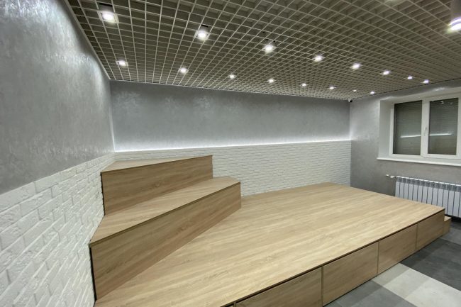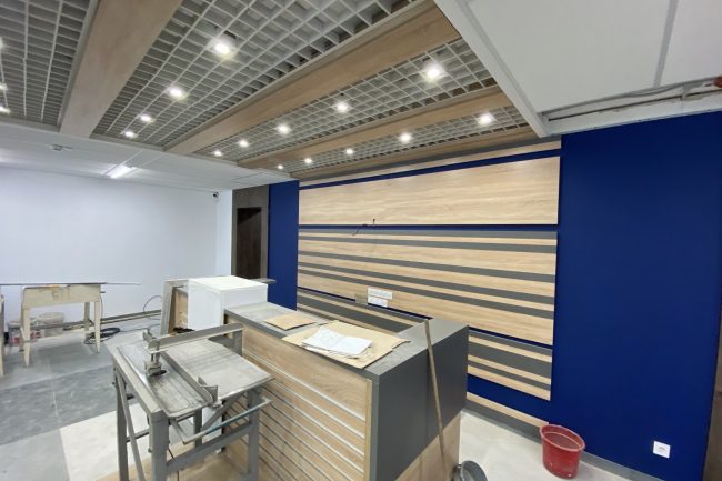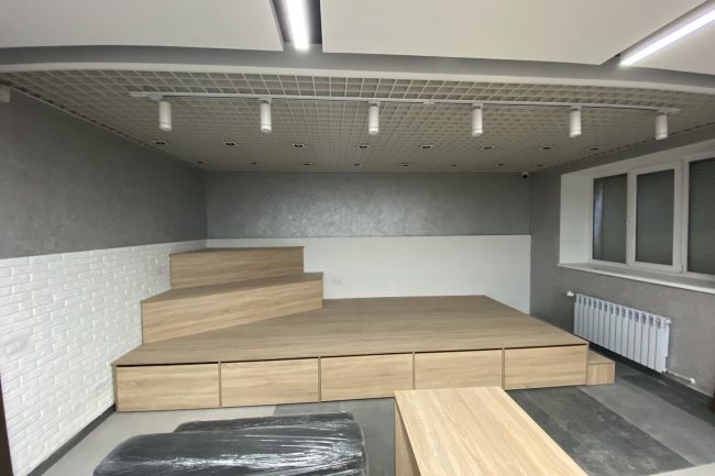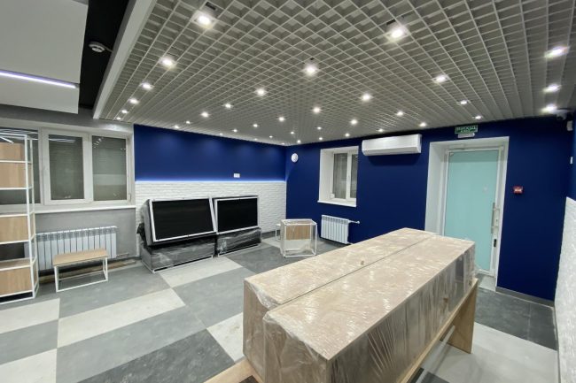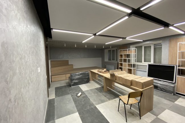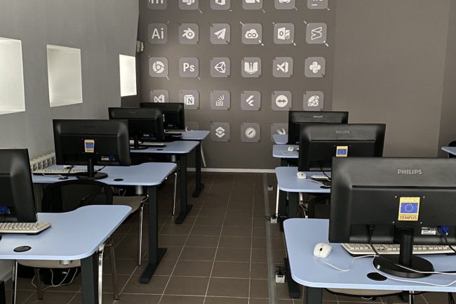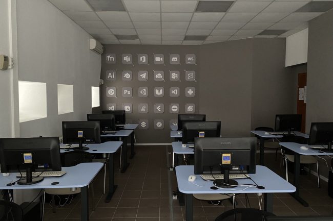 В дизайні комп’ютерних кабінетів переважають білий та світло-кавовий. Стеля обшита стельовими панелями, на стіні створено імітацію рельєфного панно з окремих елементів, що позначають різні засоби програмного забезпечення.