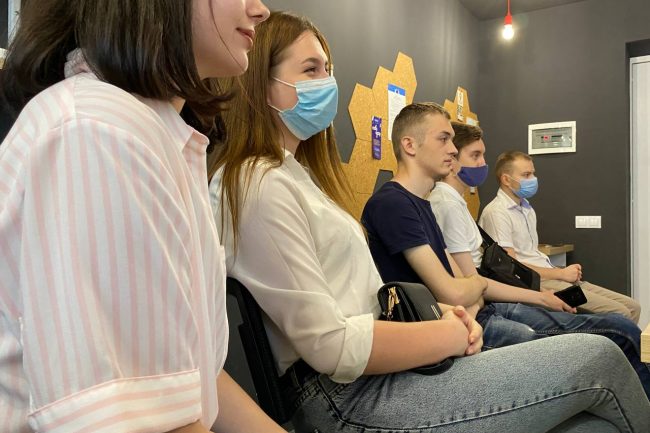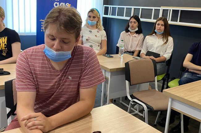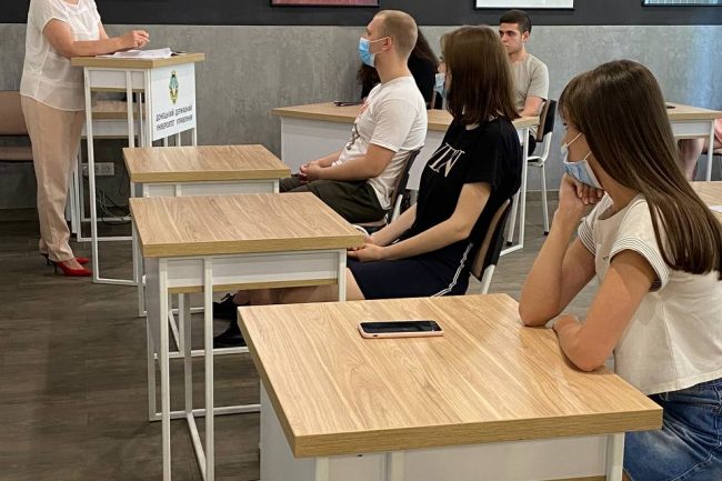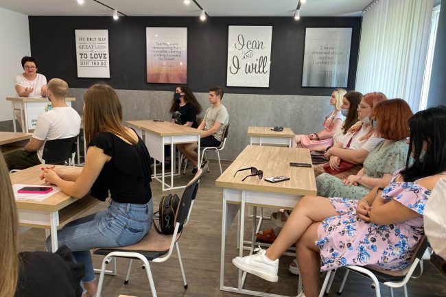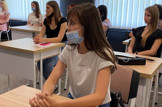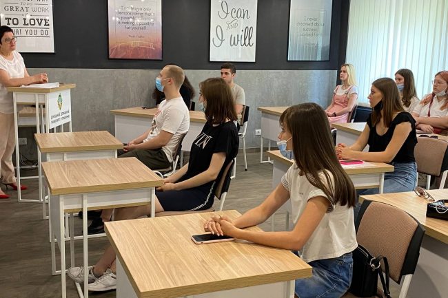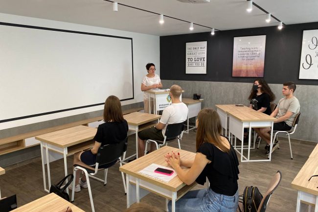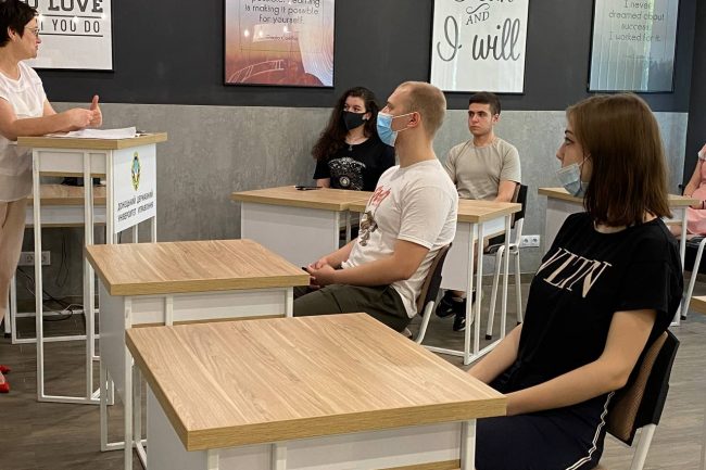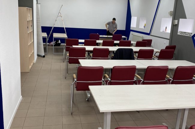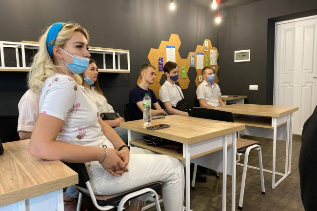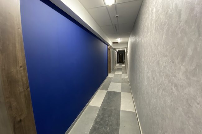 Спеціально підібрані меблі виконують утилітарну роль, нема нічого зайвого. В аудиторіях для студентів стоять одномісні столики з стільцями. Дизайн коридорів побудований на поєднанні контрастних кольорів — густо-синього, сірого, білого та малюнку натурального дерева. Підлога оздоблена плиткою білого та сірого кольору, що викладена в шаховому порядку.
