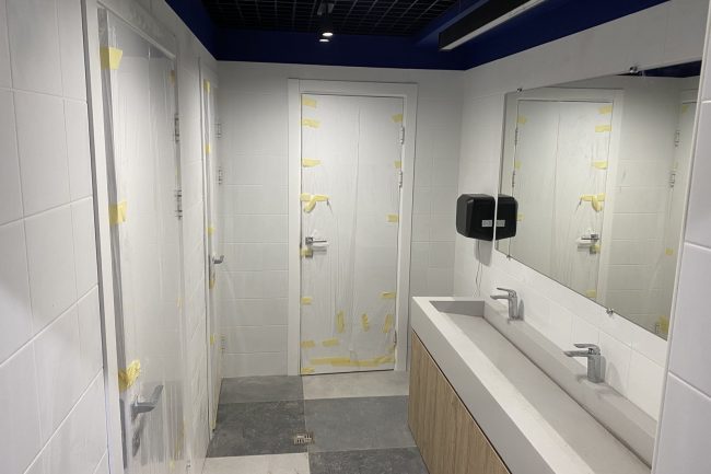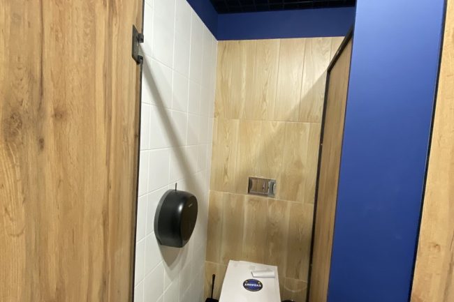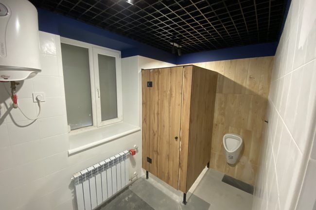 Дизайн санвузла містить інноваційні рішення в сантехніці — раковини прямокутної форми мають незвичайне, похиле в протилежному від користувача напрямку дно, що має замість круглого отвору вузьку щілину для стоку води. Білий низ із сліпучо-білою сантехнікою, хромованими шаровими кранами, шафою та тумбою під раковину кольору натурального світлого дерева конкурує з темною стелею. Вона закрита підвісною решіткою чорного кольору та тонована в густий темно-синій. Лінія розмежування кольорів знаходиться нижче від кута, що візуально збільшило висоту стін.
