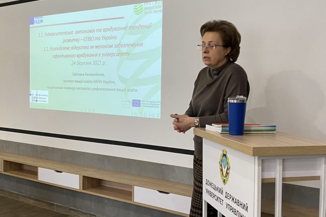 Дизайн інтер’єру Донецького державного університету управління витриманий в сучасному стилі. Для оздоблення підлог використано паркетну дошку сіро-коричневого кольору або керамічну плитку пісочного відтінку, стіни мають спокійні кольори, що не втомлюють зір. Темні площини займають простір стін під вікнами.