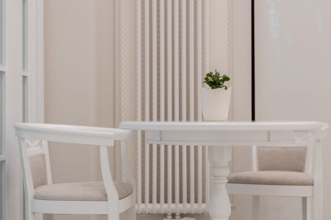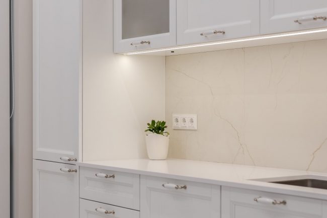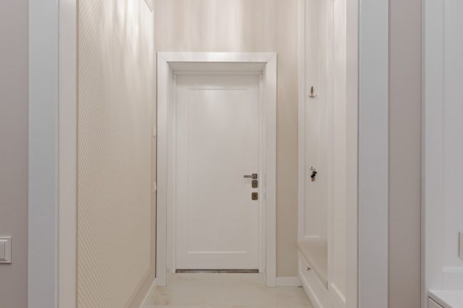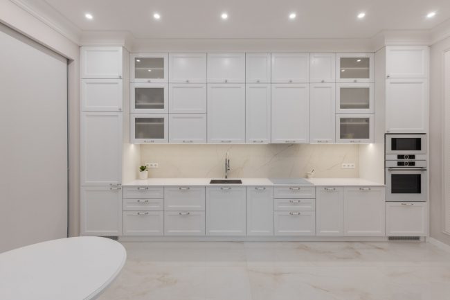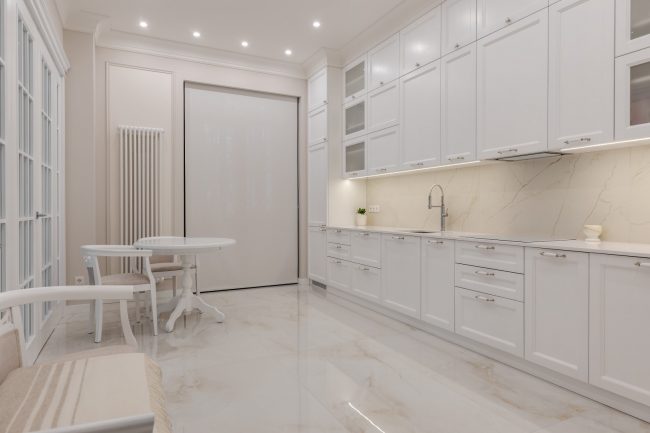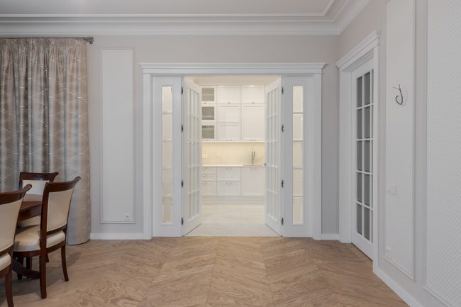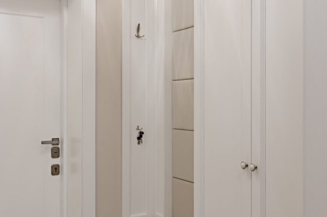 Білосніжні рельєфи фасадів кухонного гарнітура, комода в холлі, стінної шафи в передпокої, тумбочки під раковину в санвузлі виконані за єдиним зразком. Формою вони перекликаються з декоративними карнизами над дверима, що відсилають до класичних давньогрецьких портиків. Дизайн квартири доповнюють інтер’єри широкі карнизи вишуканих обрисів на стиках стелі та стін, і дорогі світильники з кришталевими підвісками.