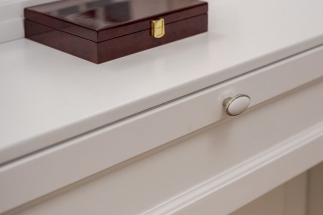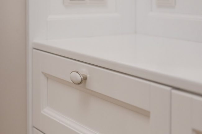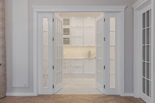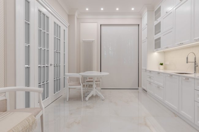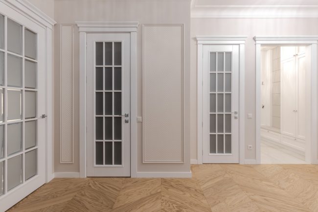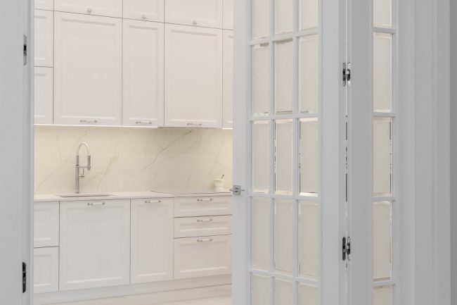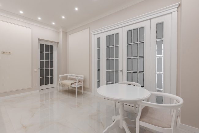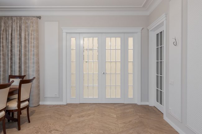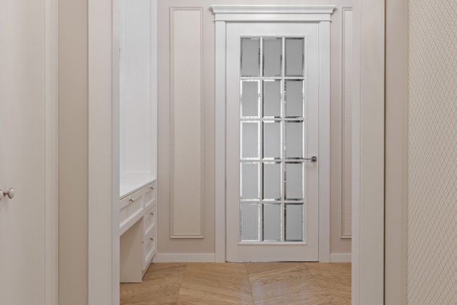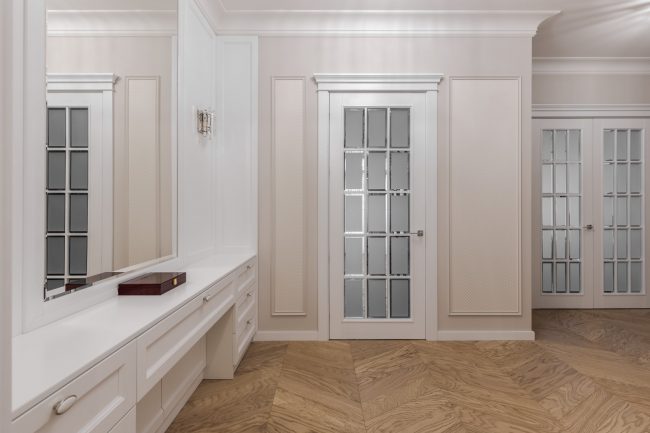 Гармонія ніжних пастельних відтінків від молочно-білого до вершкового та рожевуватого, що виокремлюються молдингами в прямокутні стінові панелі різних градацій тону, підкреслюється білосніжною поверхнею гратчастих дверей, виконаних за єдиним кресленням. Брильянтове сяйво дзеркальних фацетів вставок з матового скла надає їм ексклюзивно розкішного вигляду.