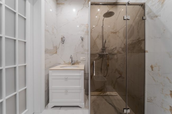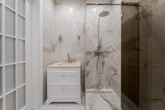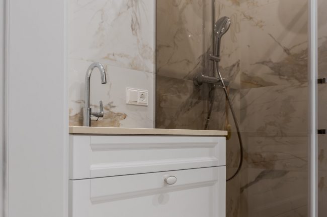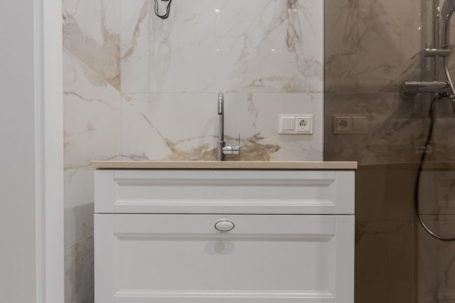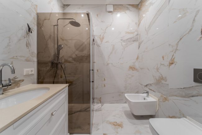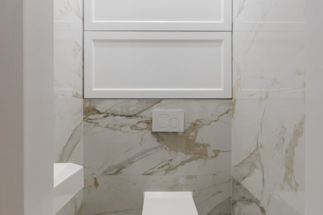 Окрасою санвузла слугує облицьовка стін натуральною мармуровою плиткою солідних розмірів.
