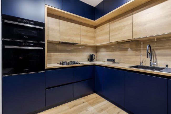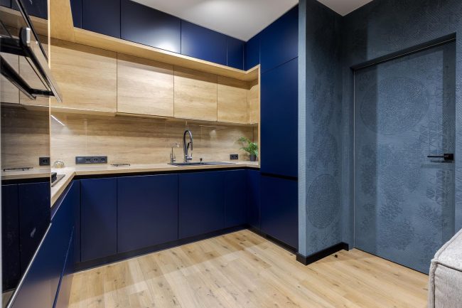Погляд не відволікається на зайві деталі, яких тут немає, натомість милується чергуванням класичного сполучення темно-синього з золотистим відтінком масиву дорогої деревини стільниці, дверцят навісних шафок, стінного фартуха, дощок підлоги.