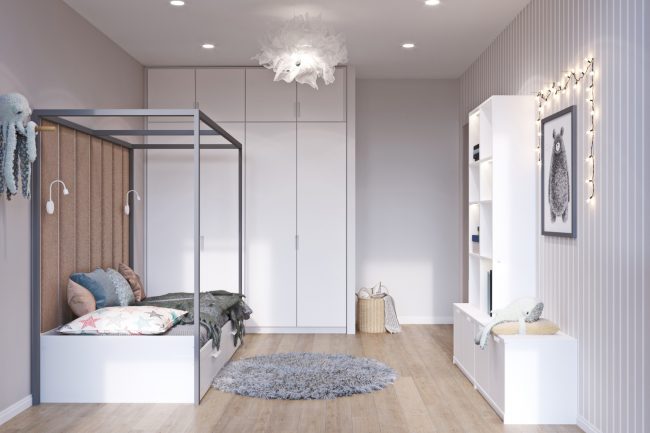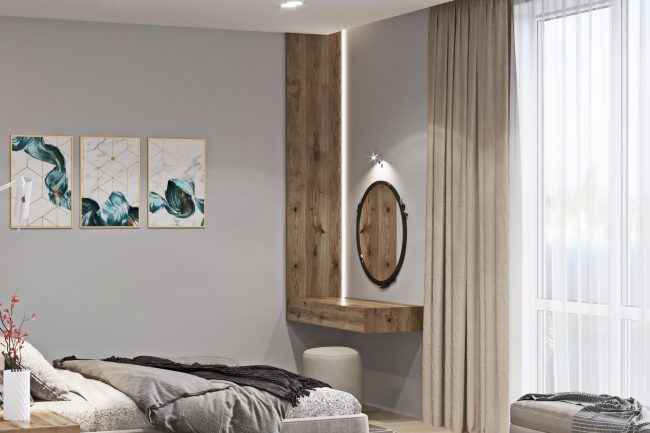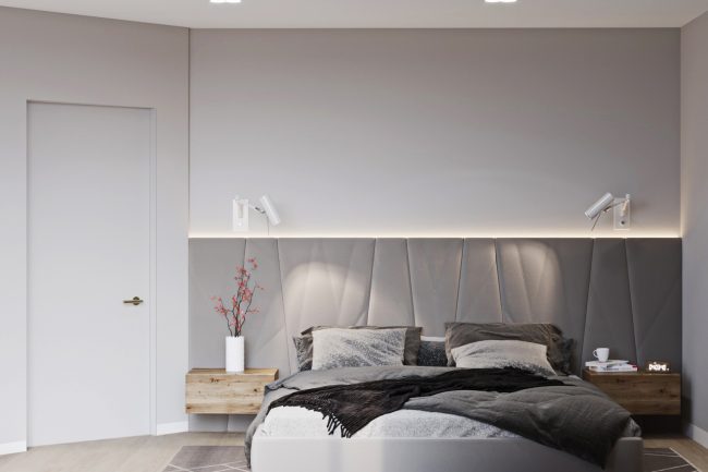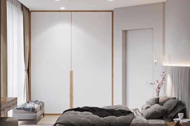 Широкими дерев’яними сходами мешканці будинку можуть підніматись на верх до своїх затишних спалень. У спальнях, відповідно до побажань замовника, передбачено мінімальну кількість елементів, лише найнеобхідніше. Тому другий поверх виконаний у стилі мінімалізм, а перший поверх має елементи скандинавського стилю. В загальному вийшов непоганий дует двох стилів, що функціонально підкреслив загальний дизайн інтер’єру будинку.