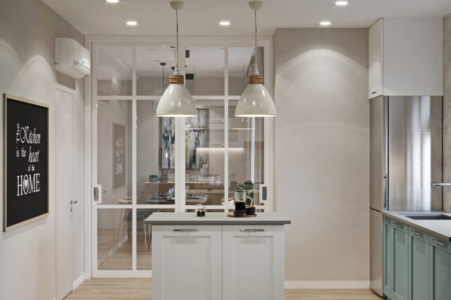 Щодо дизайну інтерʼєру першого поверху, основний акцент був зроблений на простір. Велика зона вітальні з кутовим тканинним диваном межує із зоною столової, з якої відкривається розкішний панорамний вихід на терасу. Розсувні скляні двері у білих дерев’яних рамах ведуть у простору кухню, виконану в брудних відтінках зеленого. В зоні вітальні також розташований камін, який обігріває вітальню, а через мережу повітряних каналів здійснюється опалення кімнат зверху. Опалення будинку передбачається лише теплими підлогами.