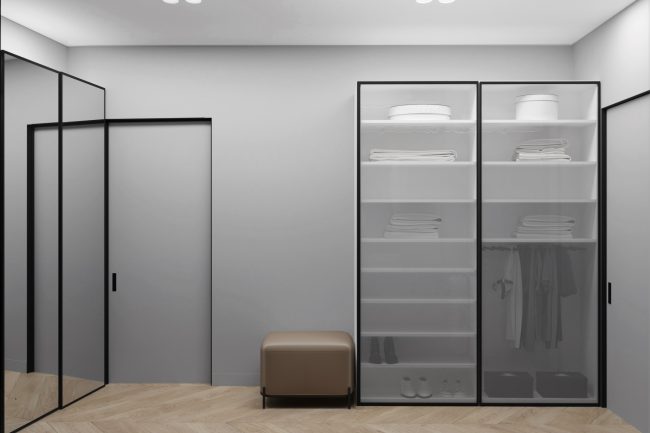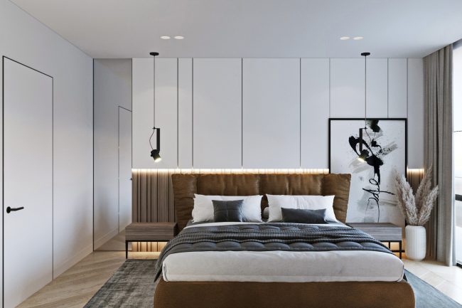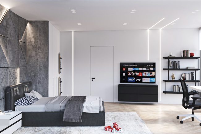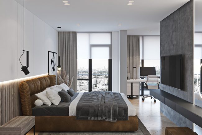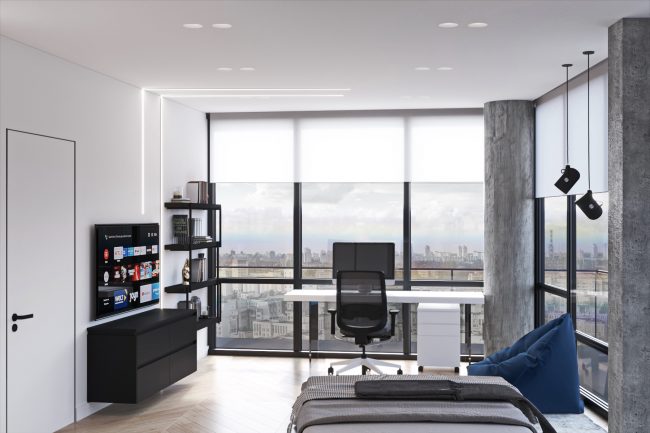 Дитяча кімната виконана в стилі для підлітка, з зоною для навчання та спальнею. Спальня господарів межує з ванною, яка має панорамний вигляд на місто. Також на поверсі розташовані практичний гардероб та приміщення для комунікацій. Загальна стилістика дизайну квартири завершена з великою кількістю дорогих дизайнерських елементів.