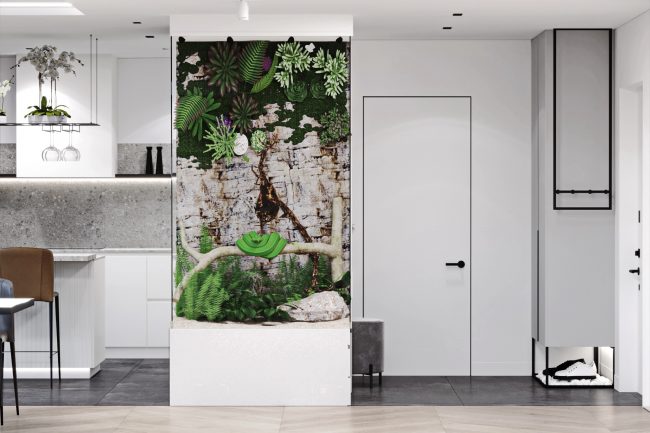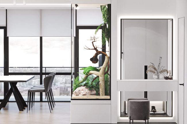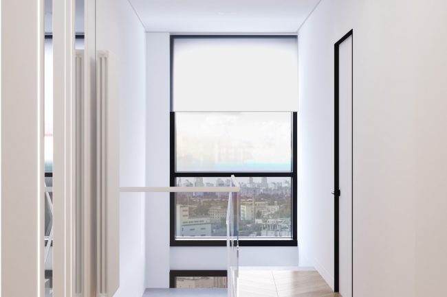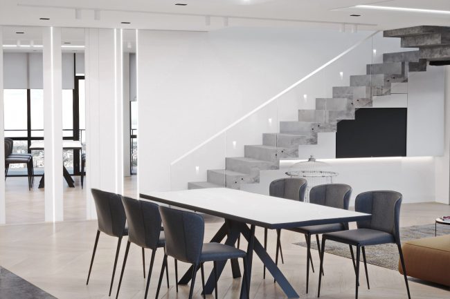 На першому поверсі розташована невелика прихожа, санвузол, велика кухня, столова, вітальня та бетонні сходи, які ведуть на другий поверх. З першого поверху відкривається панорамний вигляд на місто, що вигідно підкреслює стилістику приміщення. Прихожа не є великою з метою звільнити більше простору для інших приміщень. З прихожої можна потрапити в невеликий санвузол. Об’єднана в одне приміщення кухня, вітальня та зона столової роблять цей простір максимально відкритим та світлим. У зоні вітальні є колона, яка на перший погляд може здатися проблемою в дизайні, але ми зробили це своєю перевагою, розмістивши на колоні фіто модулі, під колоною поставили кутовий диван в рижій алькантарі. Навпроти дивану розташований величезний телевізор під відкритими бетонними сходами. Сходи виконані з натуральному безпиловому бетоні, фініш виконано мікроцементом. В зоні вітальні розміщений великий дерев’яний стіл із зручними тканинними кріслами. Прикрасою всієї зони вітальні є величезний скляний тераріум із пітоном. Кухня органічно вписана в загальний інтер’єр із острівцем та відсутністю непотрібних верхніх шаф, лише функціональні нижні секції та полички з підсвіткою. Піднявшись нагору, ми потрапляємо в просторий світлий коридор з переходами в спальні.