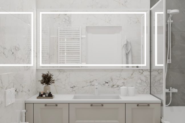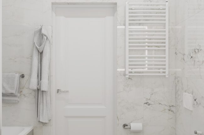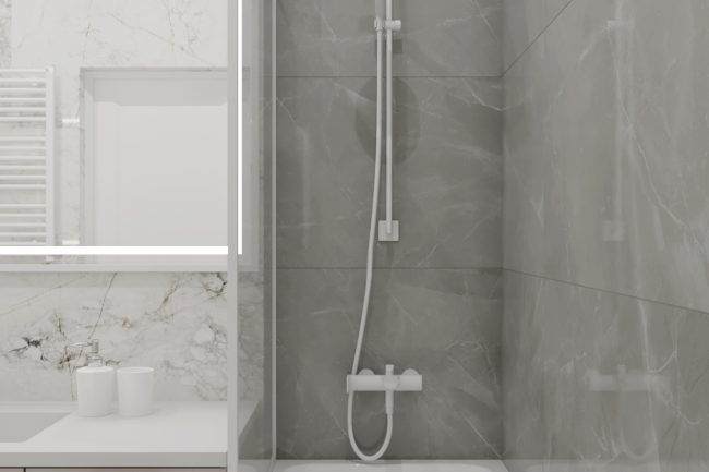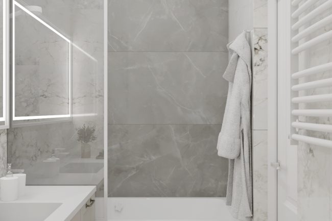 - Санвузол оздоблений плиткою під мармур з чорними акцентами, що відповідає загальній концепції класичного стилю квартири.