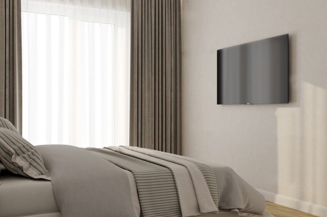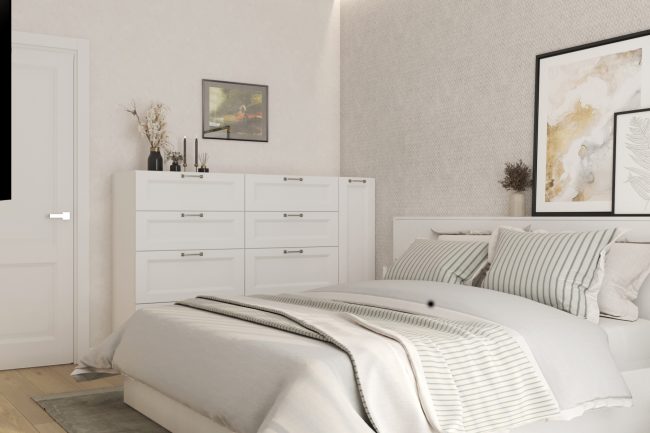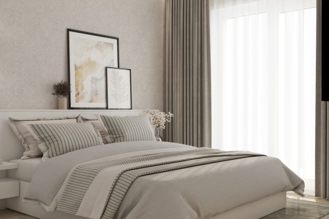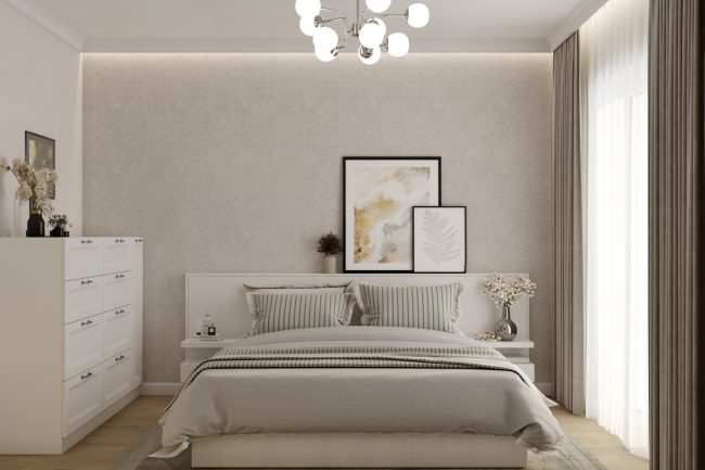 - Спальня оформлена у стриманих відтінках з акцентом на текстиль та класичні меблі, що додають відчуття затишку і комфорту.