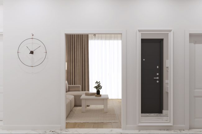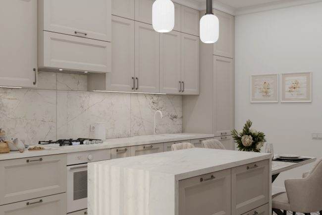 Проект цієї двокімнатної квартири в стилі неокласика поєднує елегантність класичних форм та сучасну функціональність. Використання білих класичних фасадів на кухні, плитки під Каррарський мармур з чорними акцентами, а також пастельних кольорів у вітальні створює відчуття гармонії та затишку. Це ідеальний вибір для тих, хто цінує розкіш, вишуканість і комфорт у своєму житловому просторі.