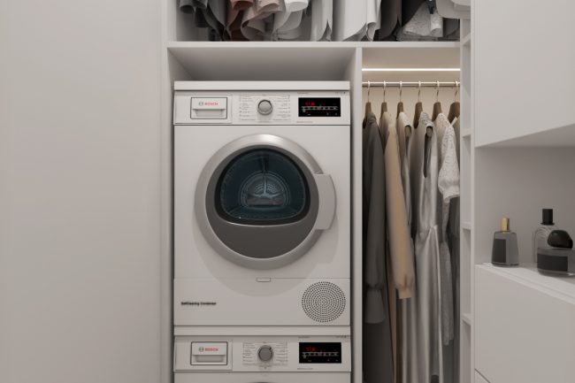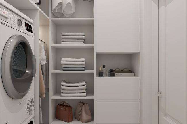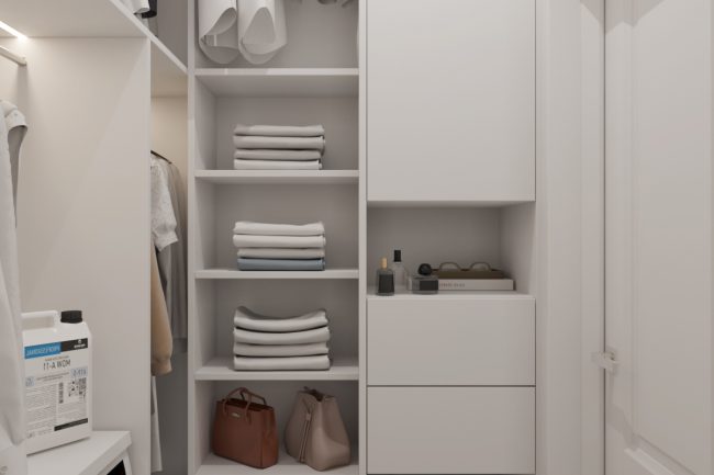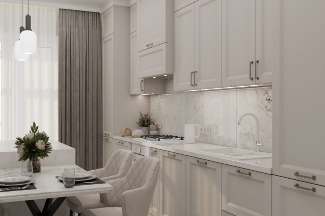 Дизайн квартири відображає класичні мотиви, які адаптовані до сучасних вимог комфорту. Класичні фасади на кухні, вишукані матеріали та м’які пастельні кольори створюють атмосферу розкоші та витонченості. Основним акцентом у дизайні є поєднання білих класичних фасадів на кухні з багатим оздобленням вітальні.
