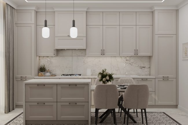 Кухня у цьому проекті виконує важливу роль. Фасади виконані у білих класичних тонах, що додає інтер’єру легкості та елегантності. На підлозі використовується плитка під Каррарський мармур, яка створює розкішний вигляд, а по центру підлоги розміщена вставка з фактурної плитки з чорним малюнком, що додає контрастності та візуального інтересу. Кухня обладнана островом, який виконує функції як робочої зони, так і місця для прийому їжі. Крім того, є зручний обідній стіл, який ідеально підходить для сімейних трапез.