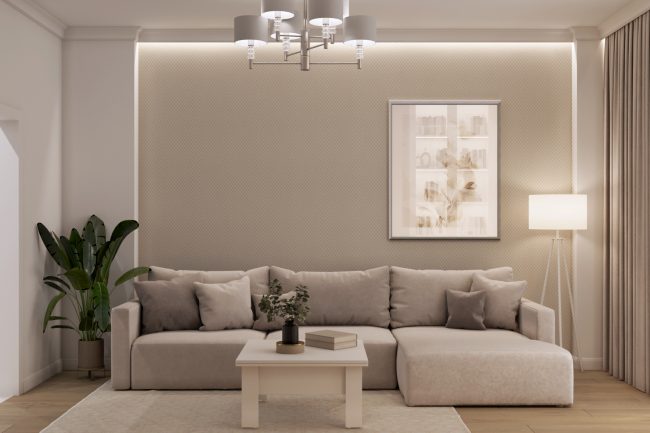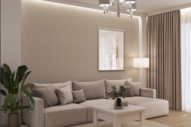 У вітальні панують пастельні кольори, що створюють атмосферу спокою та елегантності. На підлозі використана дерев’яна підлога, яка додає тепла простору. За великим м’яким диваном розміщені шпалери з ніжним малюнком, що підкреслюють вишуканий стиль інтер’єру. Вітальня оснащена велюровими шторами, які надають інтер’єру текстурності та м’якості.