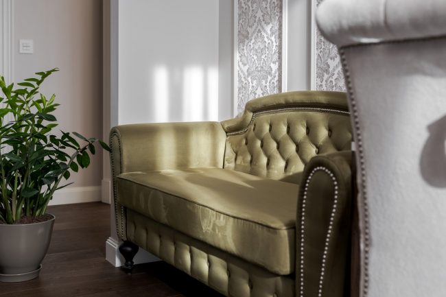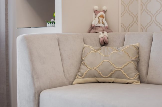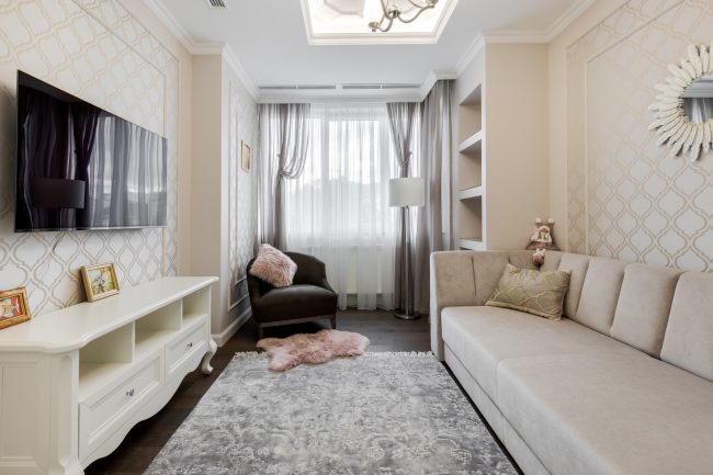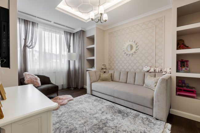 З м’яких меблів надано перевагу розкішному місткому дивану молочного відтінку з м’якою спинкою, підлокітниками, за яким на стіні знаходиться вишукане панно з центральним декоративним елементом у вигляді сонця. Весь ансамбль доповнює волохатий дорогий сірий килим.
