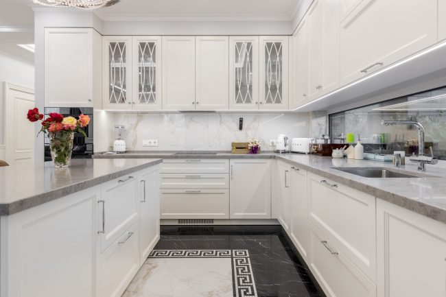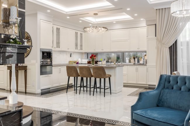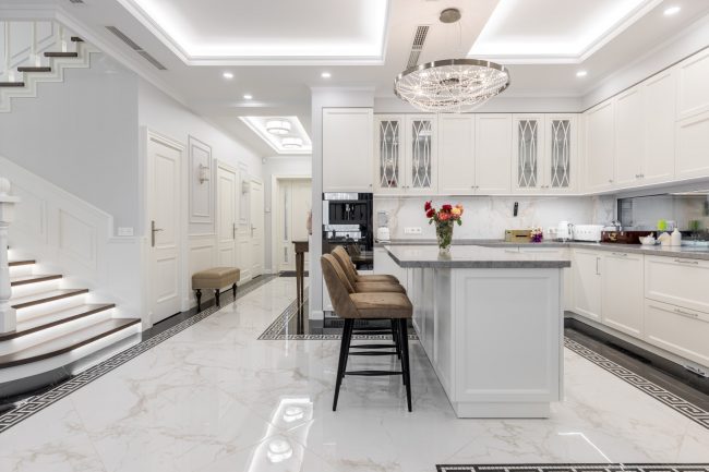 Плавний перехід до кухонної зони забезпечується відсутністю стін. Зонування досягається за рахунок застосування різних матеріалів покриття для підлоги. У вітальні це світле дерево та чорна плитка, у кухні білий з прожилками мармур. Ці зони розділено смугою грецьких меандрів.