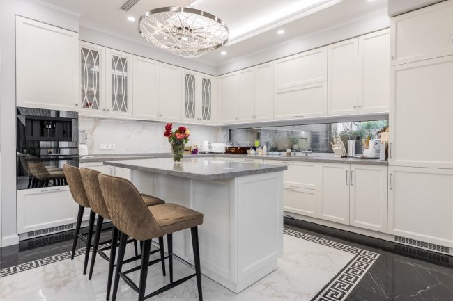 Дизайн кухні задовольняє найвибагливішого мешканця – молочно-білі меблі з підвісними шафками містять все потрібне для господині, вбудована техніка прихована за дверцятами, обідня зона розташована в центрі та доступна з усіх боків.
