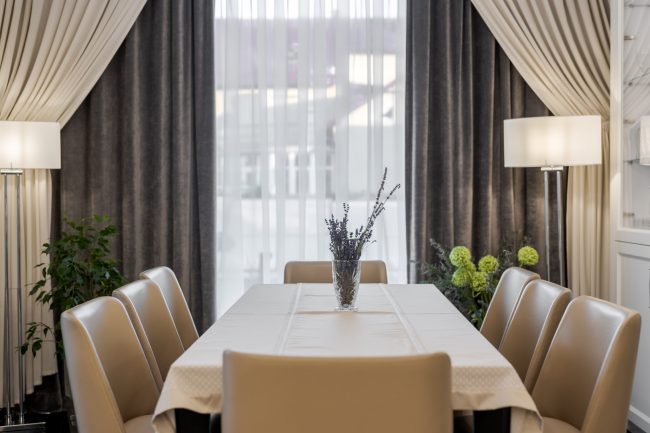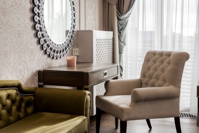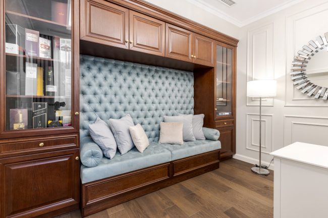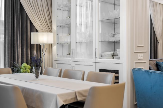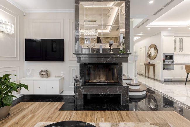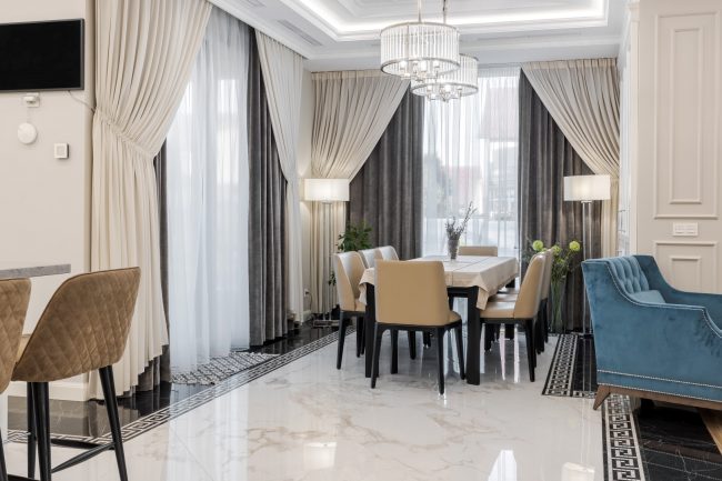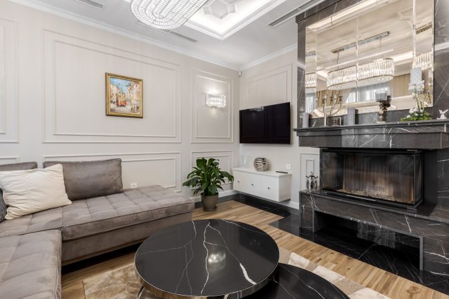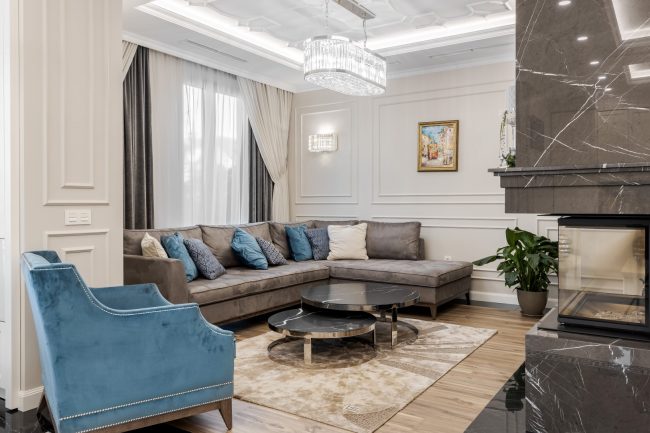Для вітальні підібрано великий сірий кутовий диван та блакитні м’які крісла, поміж якими розташовується мармуровий журнальний столик-трансформер. Навпроти знаходиться камін, оздоблений мармуровою плиткою, який зверху продовжується в дзеркальну шафку. Стіни молочного відтінку оформлені “під панелі”, які прикрашені настінними світильниками. Центральне освітлення забезпечує люстра овальної форми з підвісками з кришталю, які відображаються в дзеркальних дверцятах над каміном. Вдале поєднання матеріалів та фактур надають приміщенню розкішного вигляду.