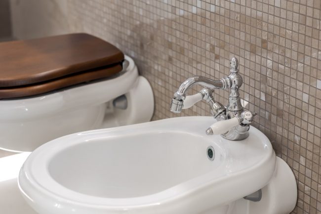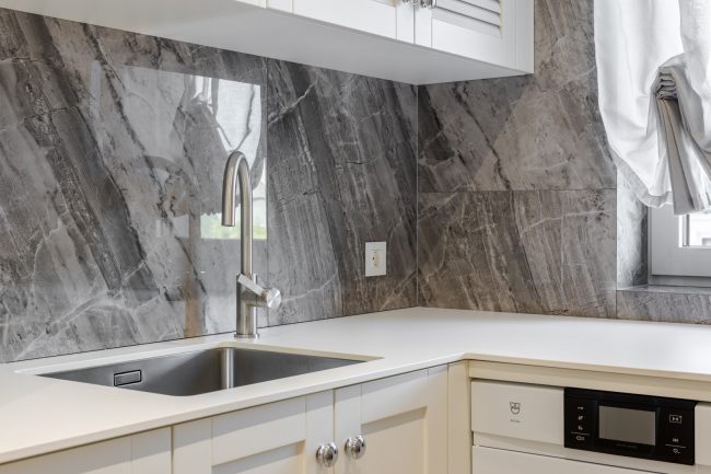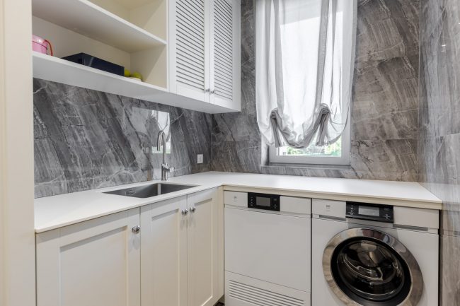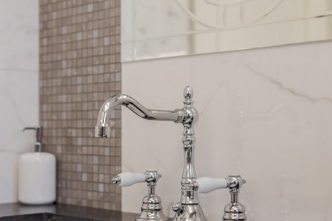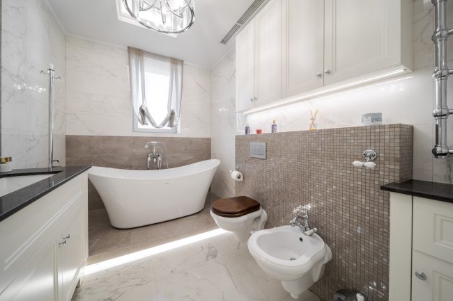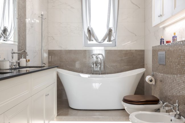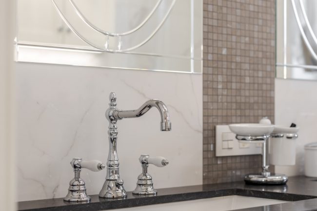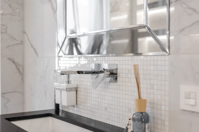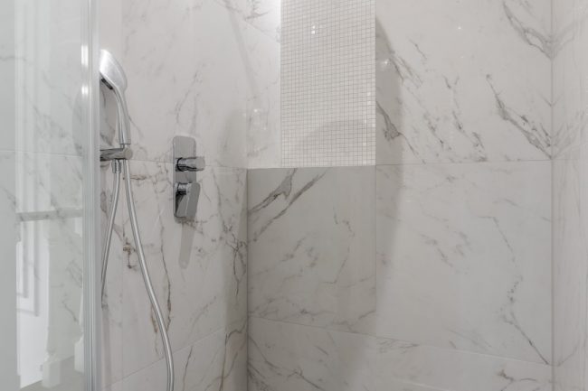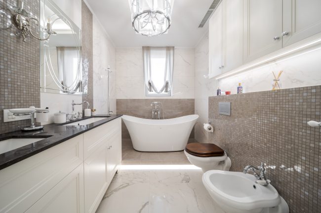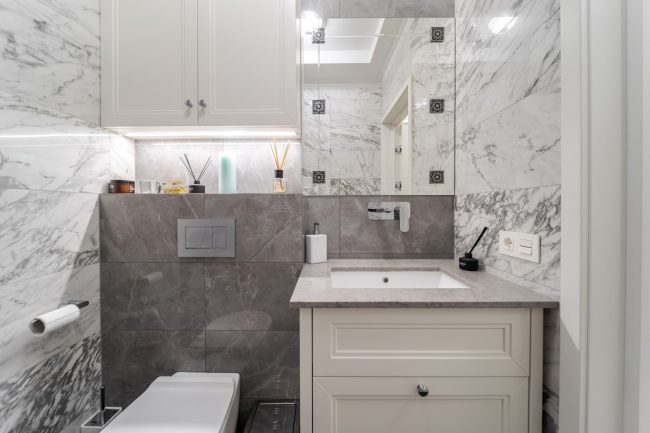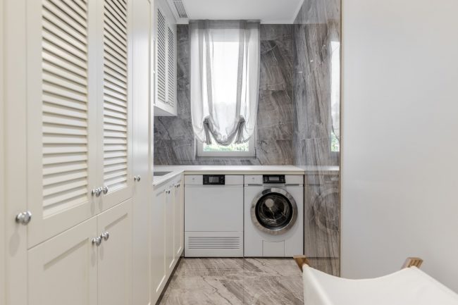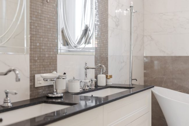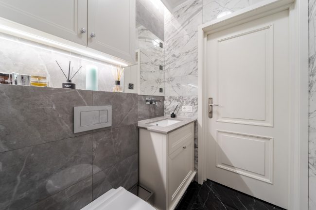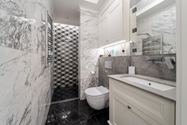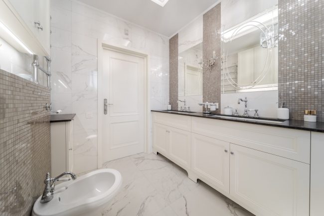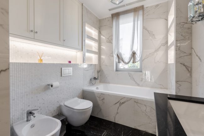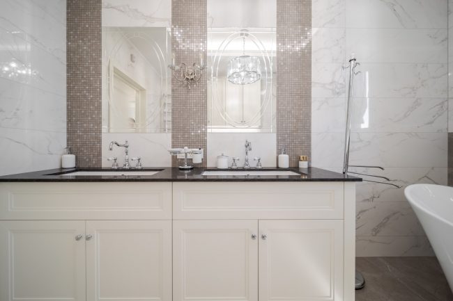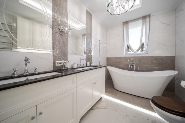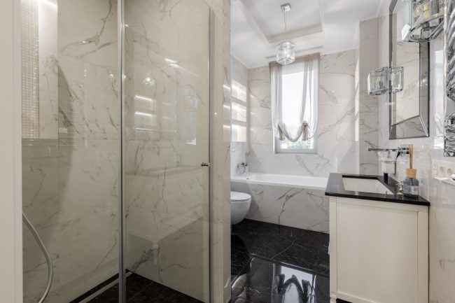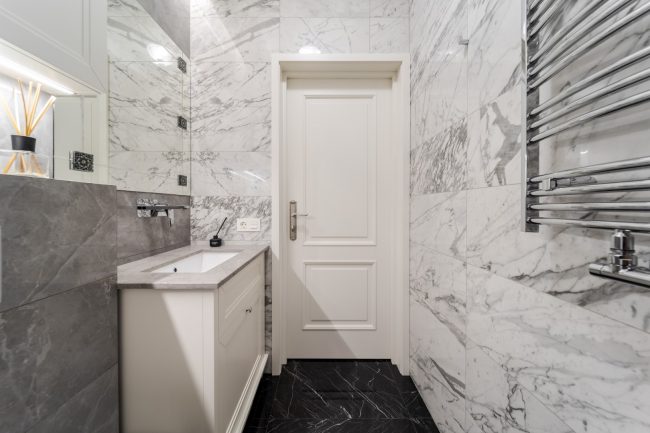 У інтер’єрі ванни переважають білий та сірий кольори, присутні на мармуровій плитці, якою оздоблені стіни, білому гарнітурі з тумби та підвісної шафки, сталевих рушникосушках.