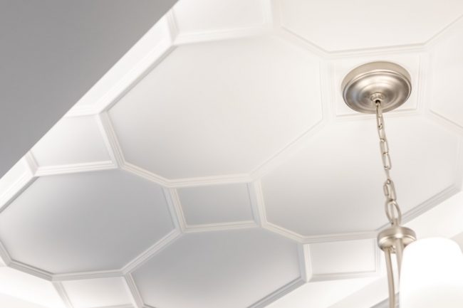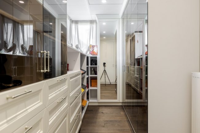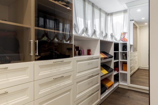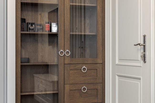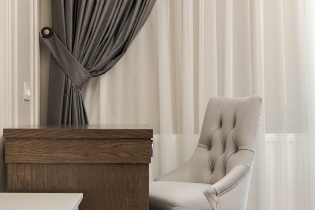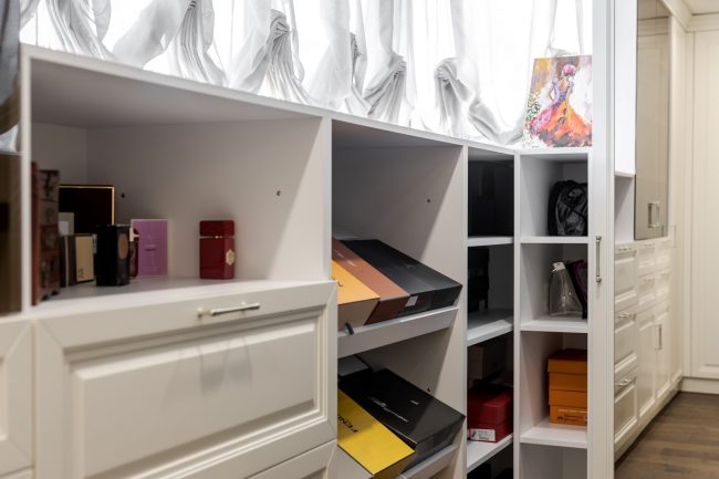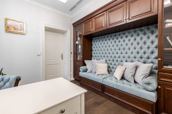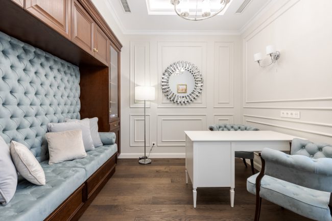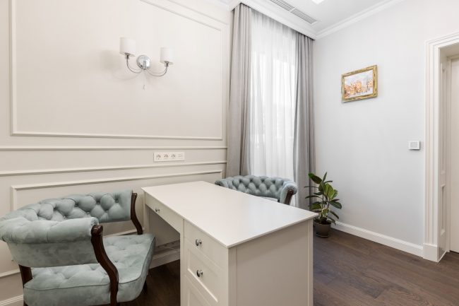 Кабінет приваблює своїм вишуканим дизайном. Тут гармонійно поєднуються молочні та кремові відтінки. Сліпучо-біла підвісна стеля має асиметрично розташований виріз прямокутної форми, де органічно розташувався світильник в неокласичному стилі. Для підлоги використано ламінат під дуб. Замість традиційних меблів вирішено спорудити стінні шафи з відкритими полицями для різноманітних дрібничок та техніки. Для карниза вибрано підвісний варіант, що не відвертає увагу зайвт=ими деталями від прозорих серпанкових тюлей та штор сірого кольору.