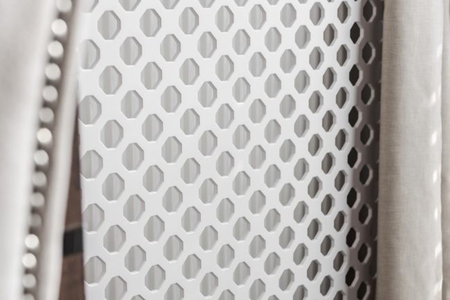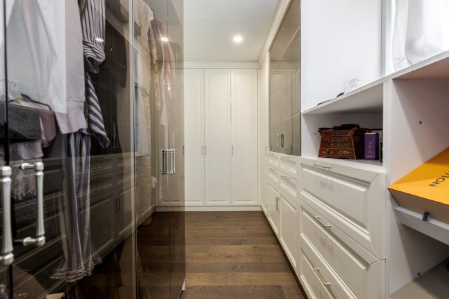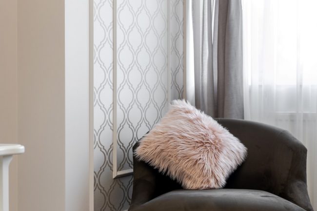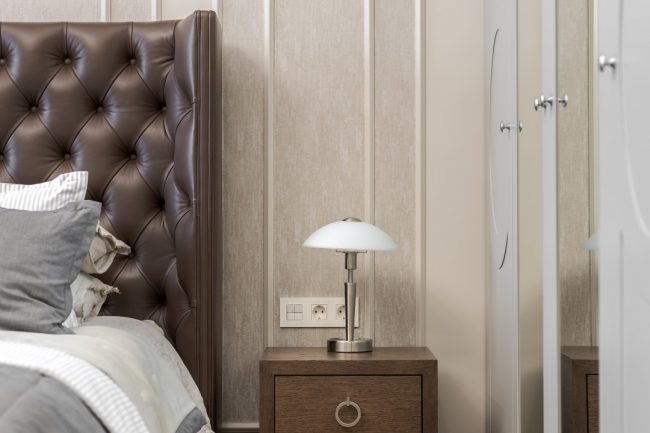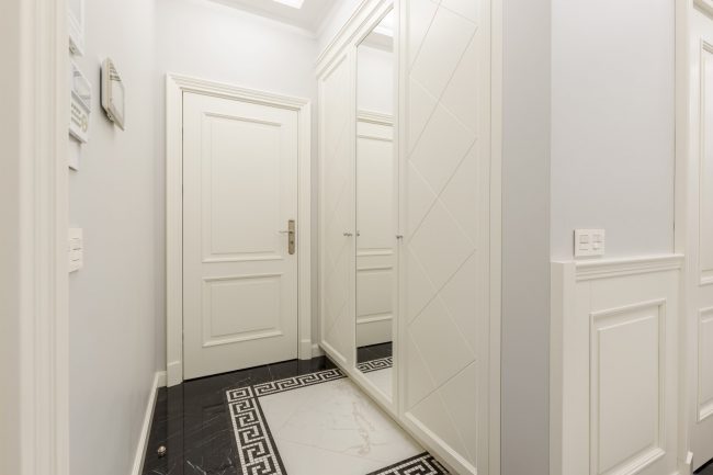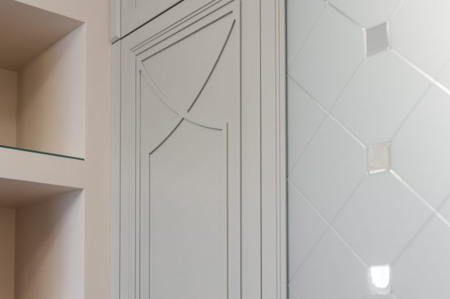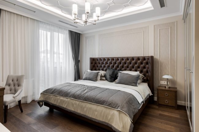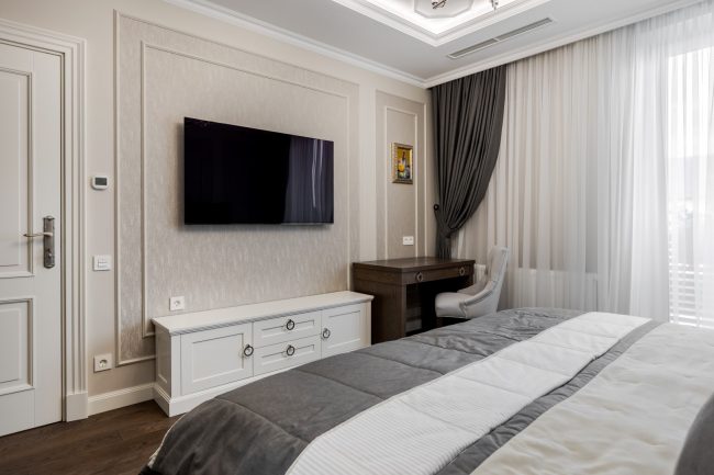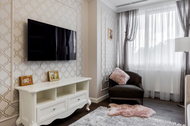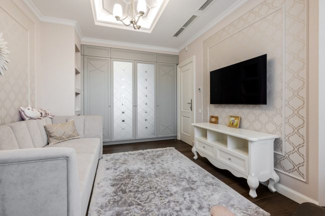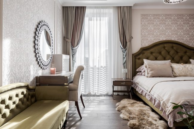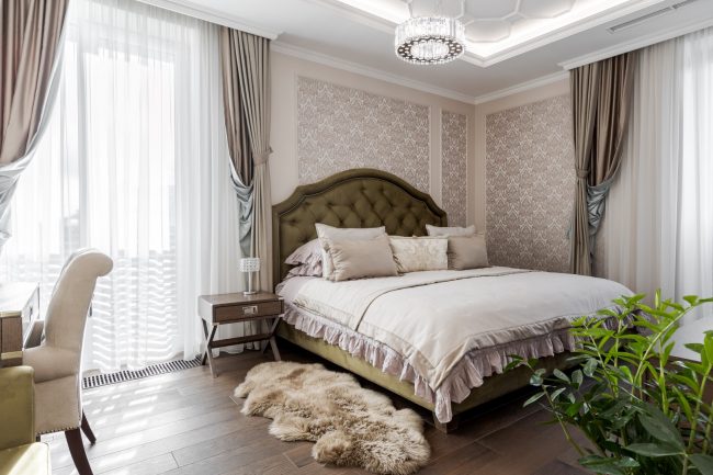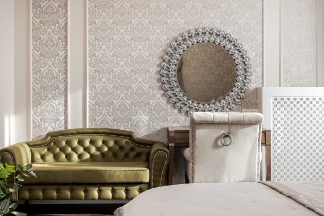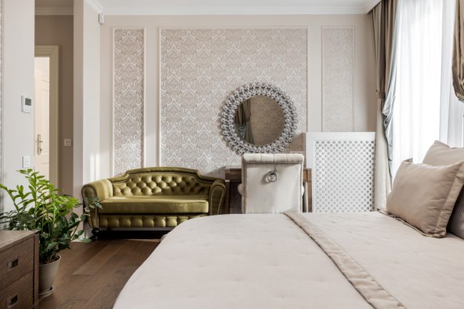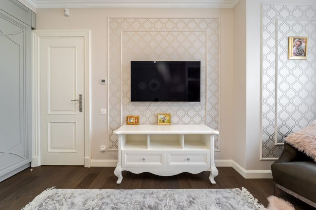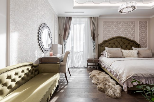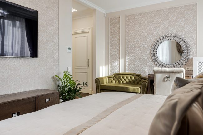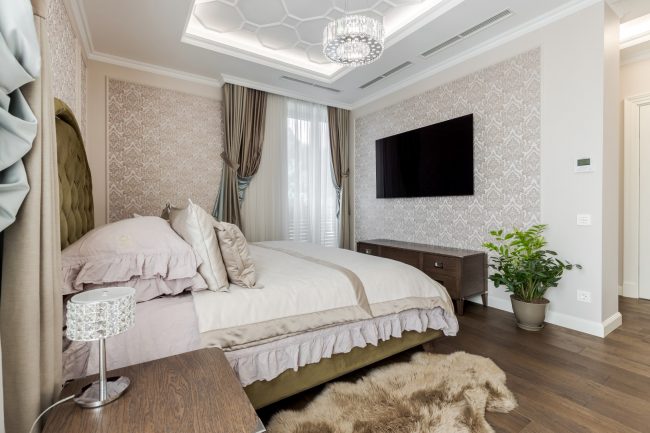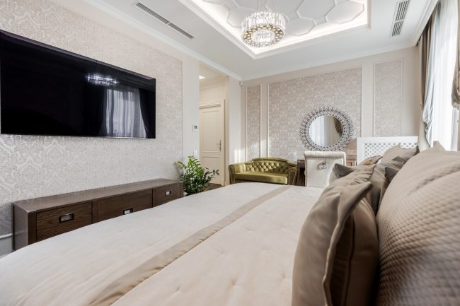 Дизайн спальні повторює стиль вітальні, білі двері підкреслюють враження чистоти та розкоші. Стіни оздоблені шпалерами з регулярним візерунком у вигляді блискучих ромбів.