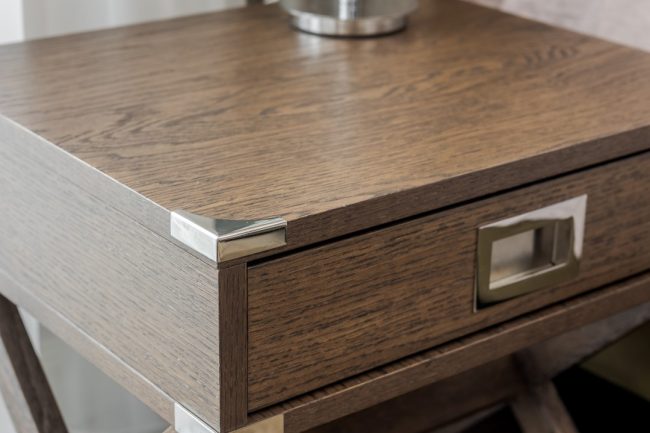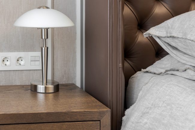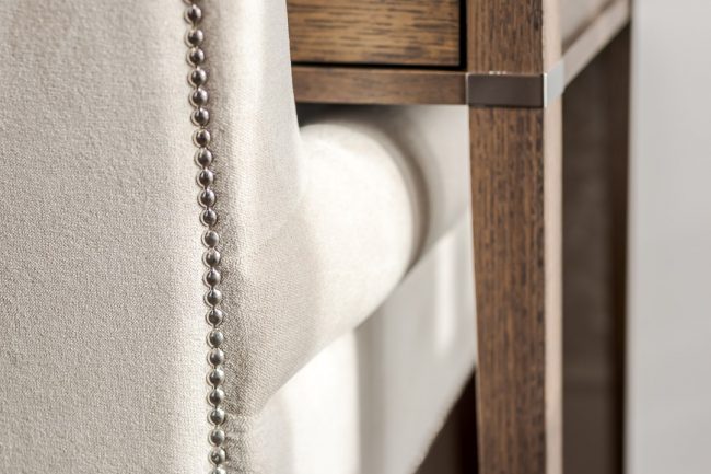 На другому поверсі розташувалися затишні спальні. Дизайн спалень витримано у тому ж стилі, з додаванням гірчичних відтінків спинки ліжка, кольору натурального дерева та великого дзеркала в розкішній срібній рамі, елементи якої нагадують павичеві пера. додаткове відчуття затишку створюють щільні двошарові портьєри в сірому та коричневому відтінках, мініатюрний столик з шухлядкою кольору натурального горіха, та елегантні настільні нічні світильники.