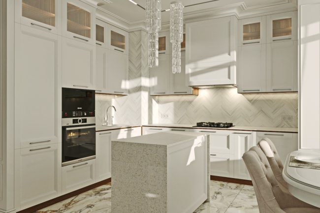 Вітальня об’єднана з кухнею, що створює відкрите та просторе середовище для спілкування та сімейних зборів. Кухонний острів служить центром цієї зони, де можна готувати, обідати та відпочивати. Білий фасад меблів контрастує з темною підлогою, що підкреслює елегантність інтер’єру. Стильні кухонні прилади та достатня кількість робочого простору роблять кухню зручною та функціональною.