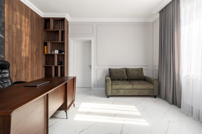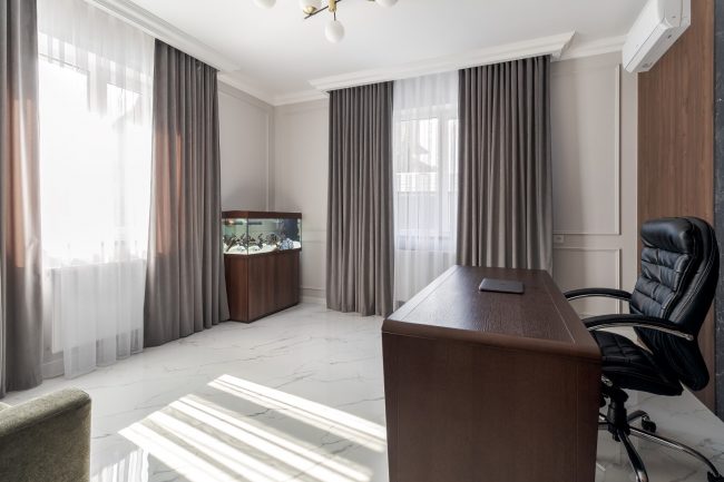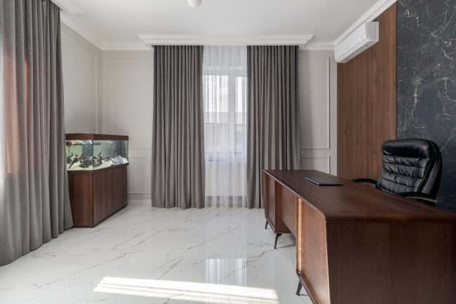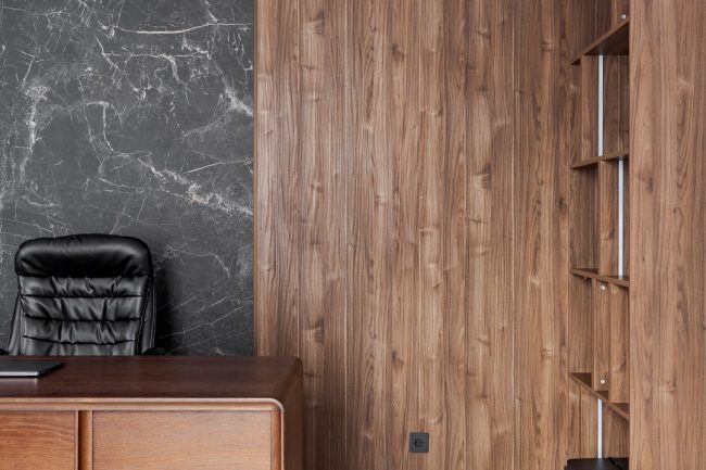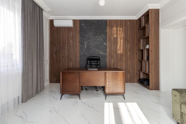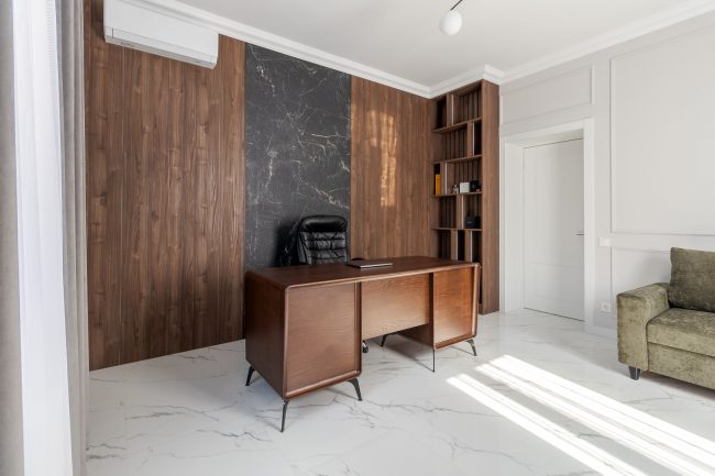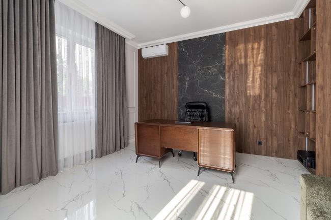 Дизайн інтер’єру кабінету свідчить про респектабельність: кабінет вмебльований м’яким диваном та широким письмовим столом з натурального масиву дерева під стіною, декорованою подібною дерев’яною панеллю.