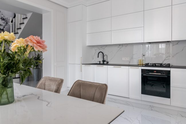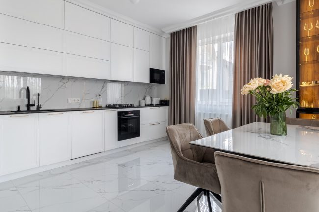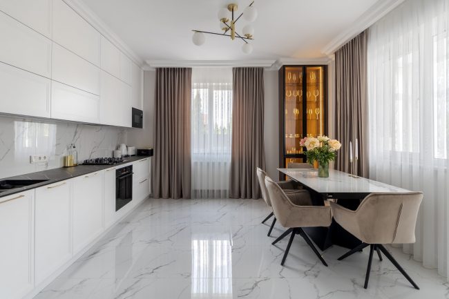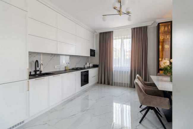 З вітальні широкий отвір в стіні веде в простору кухню-їдальню, з обіднім столом та м’якими кріслами. Лаконічні білі фасади кухонного гарнітуру, в якому розміщені всі необхідні побутові прилади, чудово доповнюються золотистим склом високого, до стелі, серванту.
