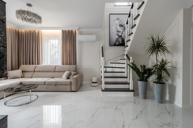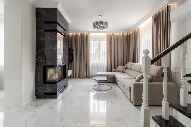 На першому поверсі розташовані кабінет, вітальня, кухня, підсобні приміщення. Всі вони добре освітлюються денним світлом завдяки наявності в кожному з приміщень двох вікон.Оформлення інтер’єрів тяжіє до єдиної кольорової гами в чорно-білих тонах — підлога всюди викладена білою глянсовою керамогранітною плиткою з ледь помітними сіруватими розводами фабрики Atlas Concorde, у вітальні – величний камін під стелю облицьований благородною мармуровою чорною плиткою з білими розводами, з того ж матеріалу — стільниця круглого журнального столика біля великого бежевого кутового дивану.