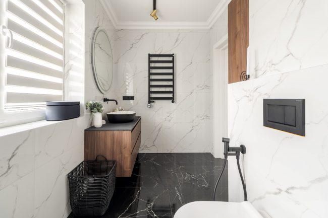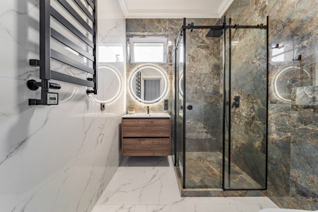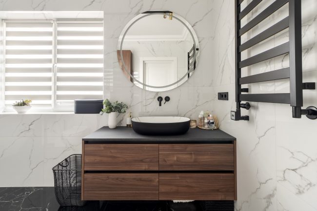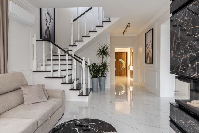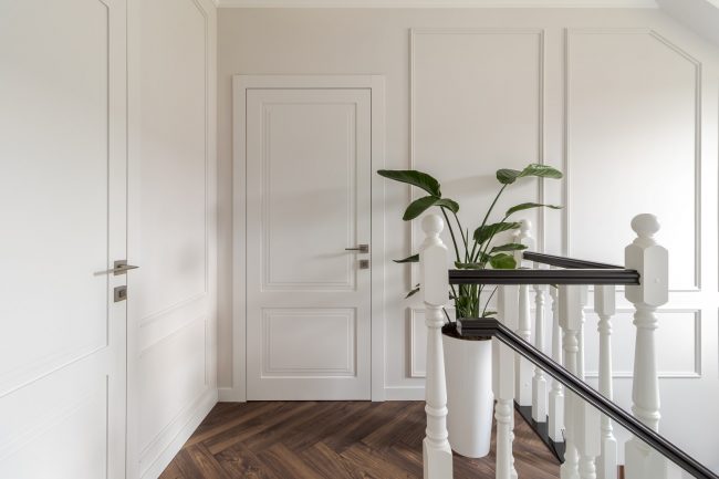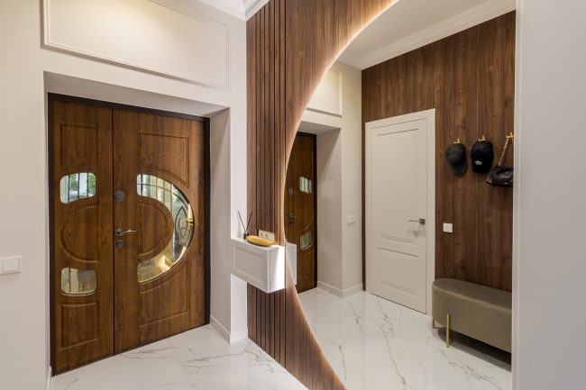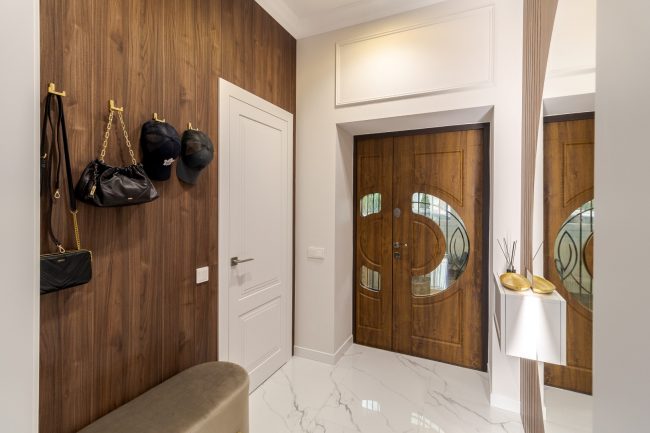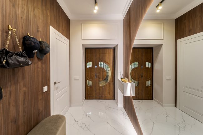 Дизайн інтер’єру будинку в неокласичному стилі приваблює строгими лініями та формами, застосуванням дорогих натуральних, якісних матеріалів, впевненою респектабельністю. Подвійні вхідні двері з масиву деревини, посилені в місцях скляних вставок металевими гратками, служать окрасою передпокою та надають будинкові надійності і захищеності. Візуально подвоює приміщення величезне кругле настінне дзеркало, що дає змогу якнайкраще оцінити свій зовнішній вигляд на повний зріст.