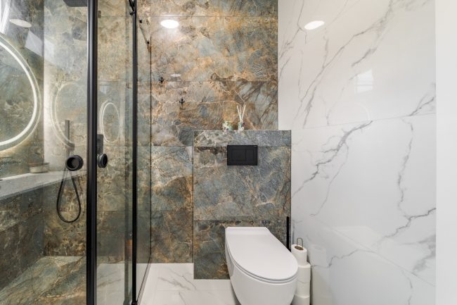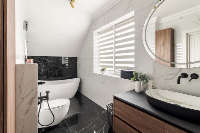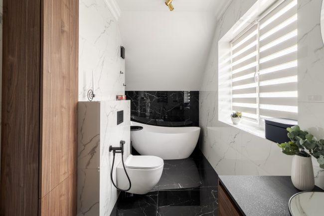 Сходи на другий поверх в тому ж чорно-білому оформленні ведуть на другий поверх в дві світлі спальні, де найраціональніше використано доступну площу. Два санвузли багато та вигадливо декоровані, обставлені ванною, душовою кабіною, та іншою сантехнікою сучасного дизайну.