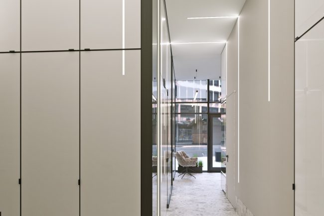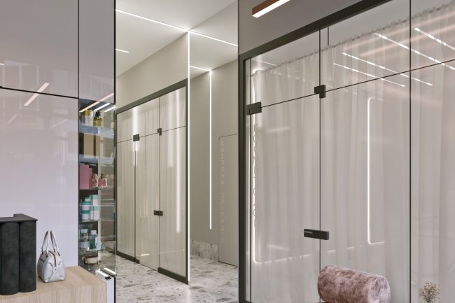 Салон лазерної епіляції “Неолазер” вражає своїм сучасним стилем, де чорні кольори і білі глянцеві поверхні створюють враження елегантності та розкоші. Інтер’єр оформлений з використанням скляних перегородок, які надають простору відчуття відкритості та легкості, при цьому забезпечуючи приватність для клієнтів.