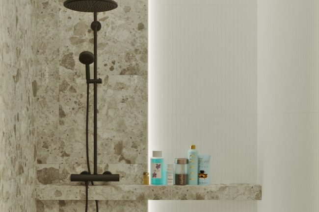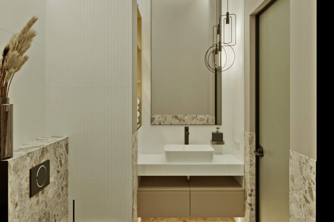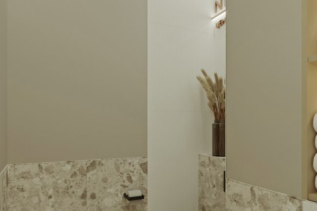 На підлозі використано стильну плитку тераццо, яка не лише додає естетики, а й робить приміщення більш практичним. Дерев’яні поверхні у меблях додають затишку та тепла, створюючи комфортну атмосферу для відвідувачів.