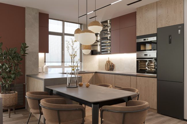 Велика кухня-вітальня з островом стає не лише місцем для приготування страв, а й ідеальним простором для зустрічей з друзями та родиною. Теракотові відтінки стін у вітальні додають тепла та атмосфери.