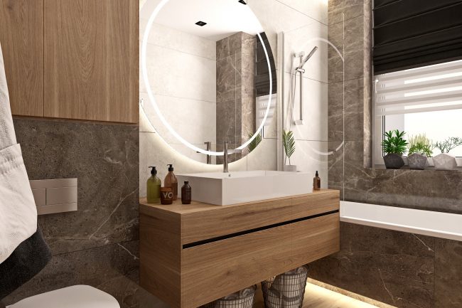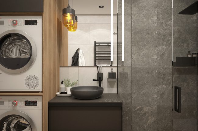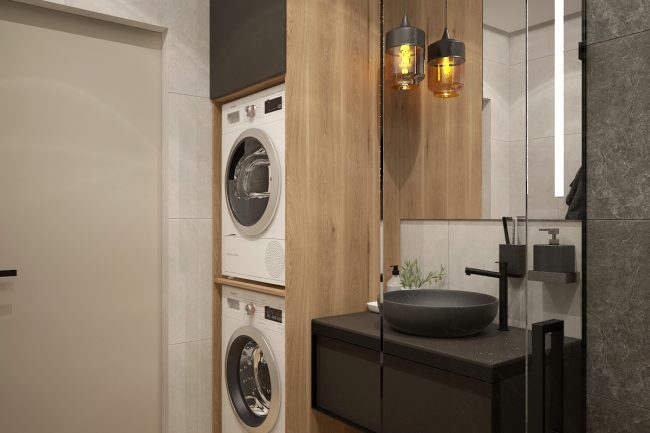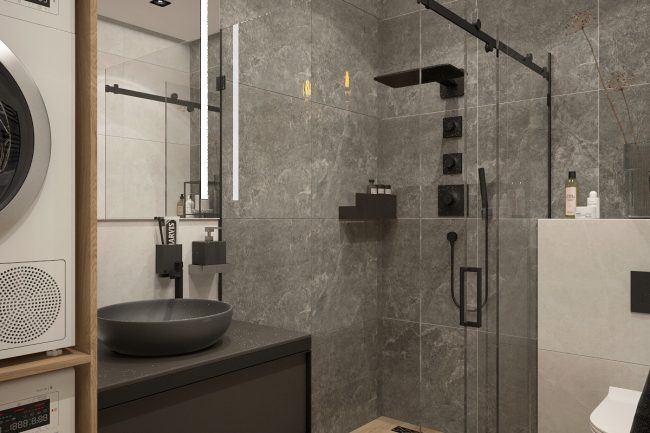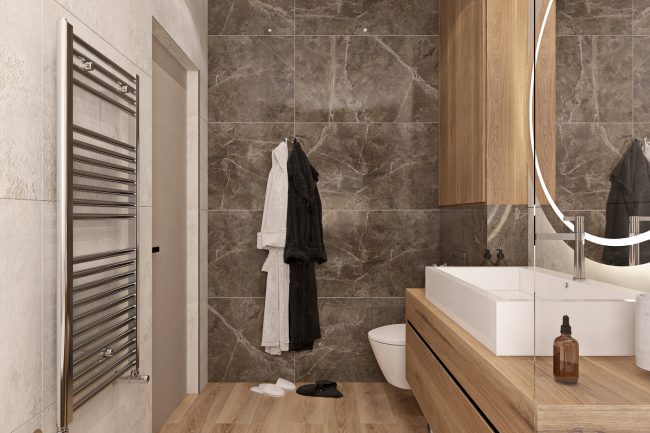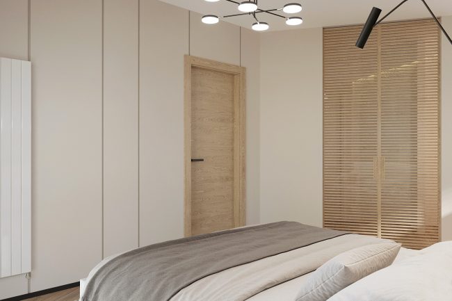 Санвузол із поєднанням плитки під сланець та дерева пропонує неповторну текстуру і природну атмосферу. Спальня, що межує з великим гардеробом, стає оазисом для вашого стилю та комфорту.