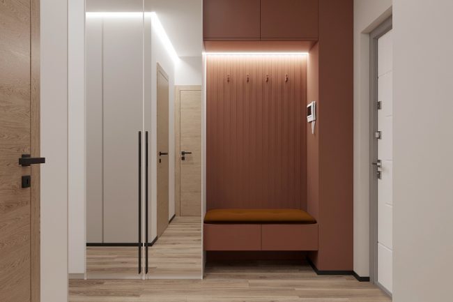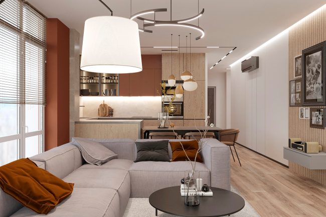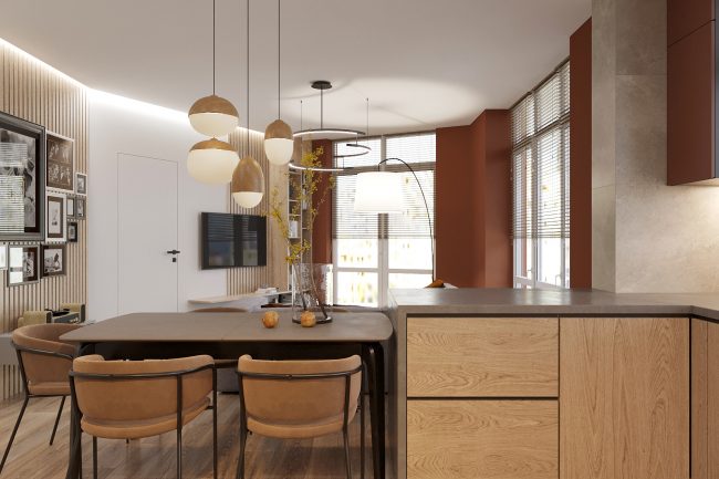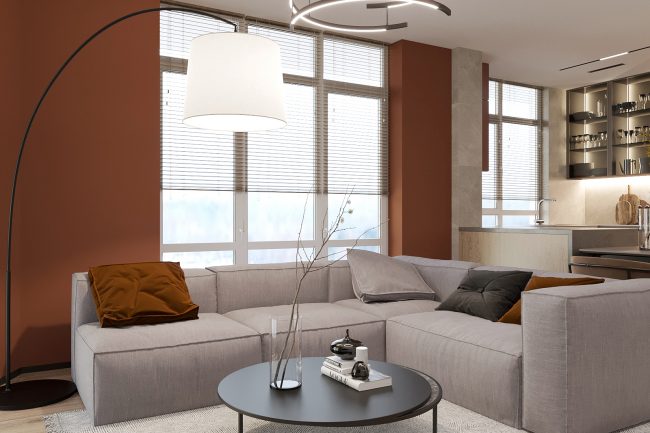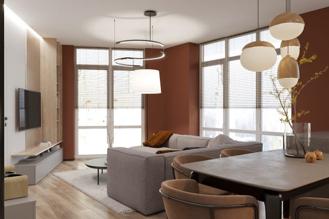 Дизайн інтер'єру квартири з теракотовими стінами.