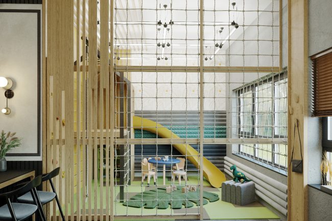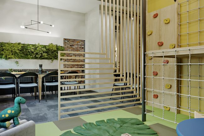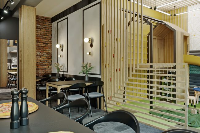Зона для дітей передбачає розважальну зону для дітей та місце для очікування батьків за горнятком ароматної кави. На підлозі використали керамограніт з вставками з фактурної плитки, на стінах – нарізка з бельгійської автентичної цегли. Стеля виконана в дерев’яному стилі з чорною вагонкою в поєднанні з брусами зі світлого дерева. Освітлення виконано багатофункціонально з використанням люстр, точкового освітлення на стелі та декоративних рамок на стінах. Дизайн інтер’єру піцерії сплановано так, щоб в ній було комфортно перебувати як вранці, так і за обіднім ланчем чи під час вечері.