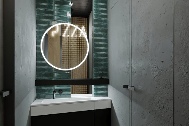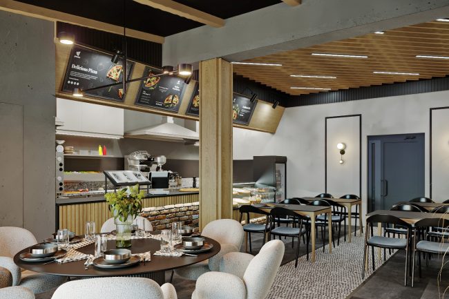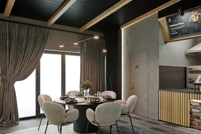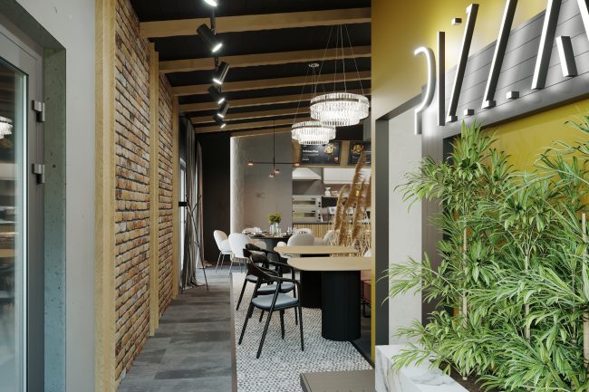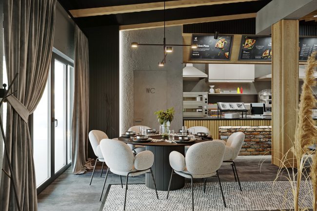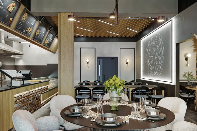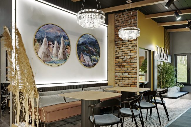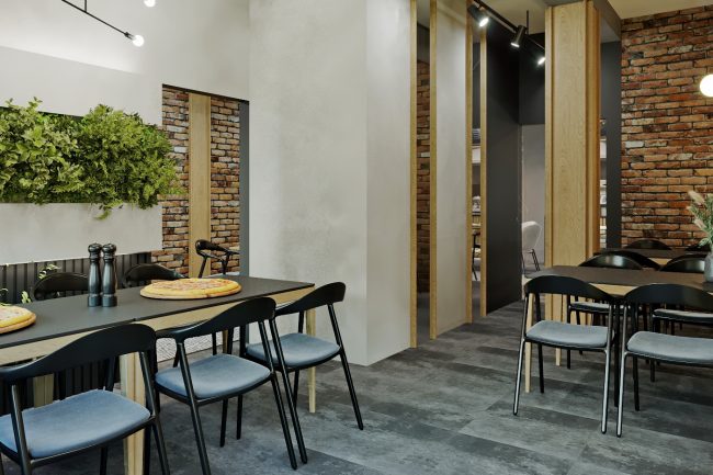 Дизайн інтер’єру піцерії виконано в стилі Лофт з використанням традиційних для цього стилю кольорів та матеріалів. Планування піцерії виконано з чітким розмежуванням зони для відвідувачів, які хочуть швидко перекусити, зони для обіду та вечері, та зони для відпочинку із дітьми. Перша умовна зона розташована відразу при вході в піцерію, де відвідувачі можуть розміститись на комфортних м’яких диванах вздовж стіни. Далі ця зона переходить у зону для затишного вечора та святкування урочистих подій. Для святкування ми виділили місце біля панорамного вікна та встановили там зручні крісла та великий круглий обідній стіл, який органічно вписується в дизайн основного залу. Ця зона плавно переходить у зону основного залу, де можуть розміститись одразу близько 20 відвідувачів.