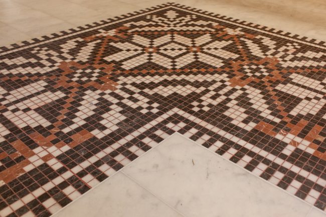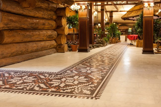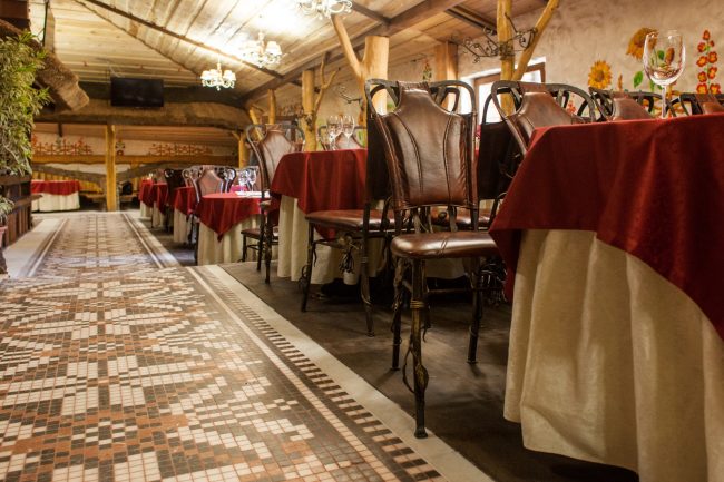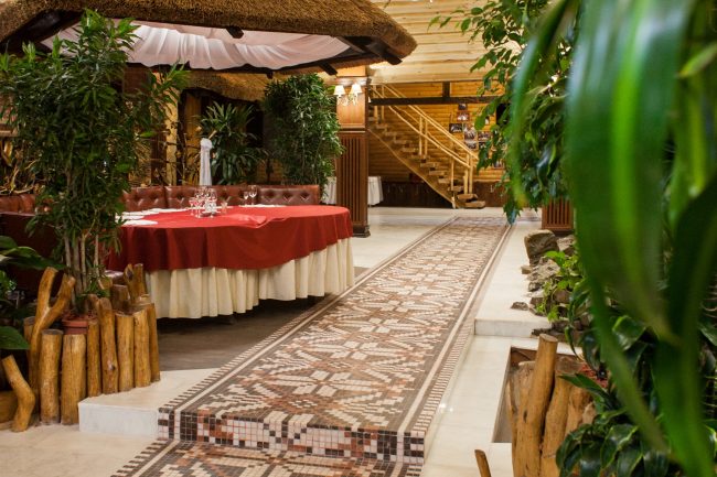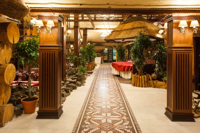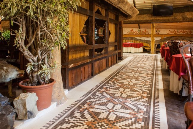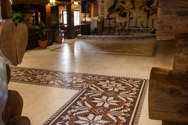 Розкішні вхідні двері з дорогою різьбою, із вставками вітражного скла, відкривають перед гостями світ забутої старовини, відомої нам з музеїв старожитностей. Гостинно запрошуючи вглиб ресторану, вздовж підлоги простягається мозаїчна доріжка з натурального мармуру, що символізує вишивку хрестиком.