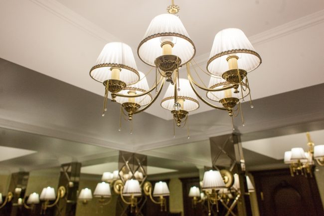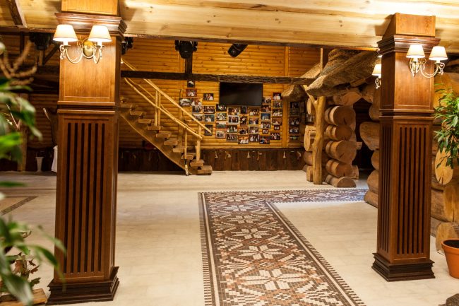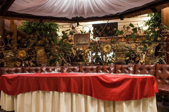 Зачарований м’яким сяйвом вінтажних світильників, укріплених на чотиригранних різьблених колонах, зупиняючись на окремих деталях, погляд не одразу може охопити все багатство інтер’єру ресторану, кожен елемент якого любовно вписаний в загальну картину.